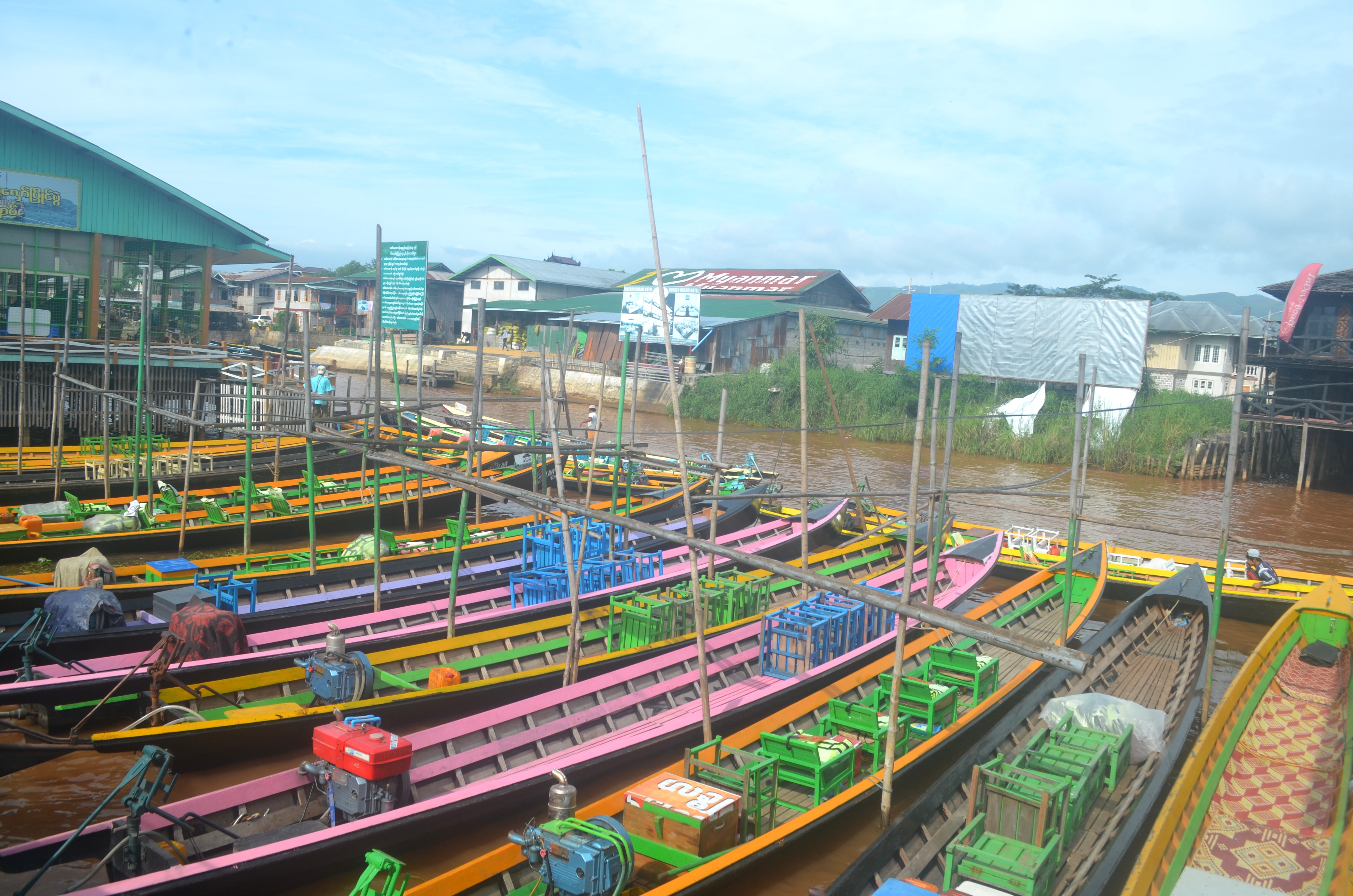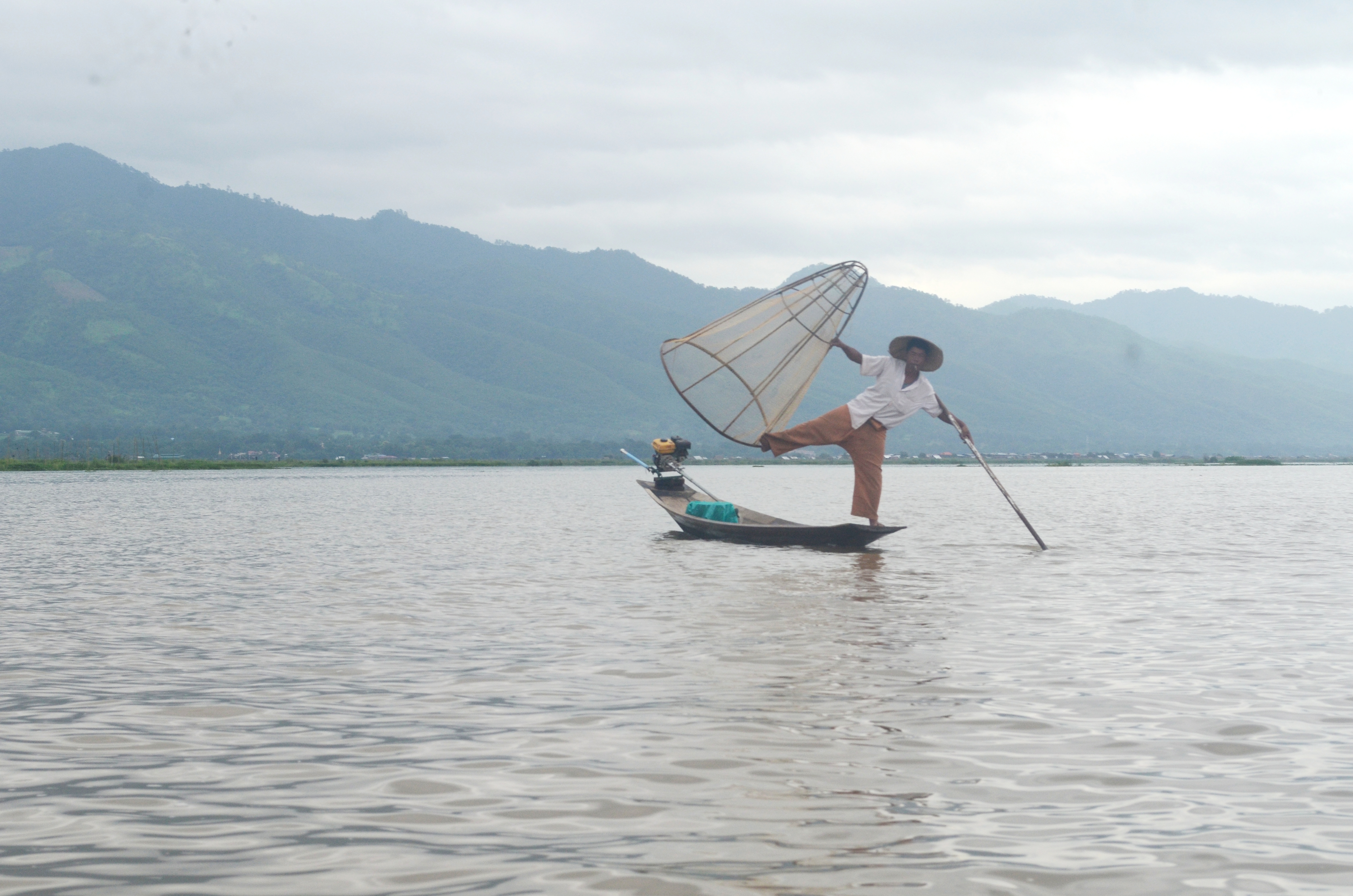 Bởi Inle là “hồ trên núi” nên một tour đi thuyền tới các điểm trên hồ là điều bắt buộc phải làm khi tới đây. Giá thuê một chiếc thuyền một ngày vốn đã không đắt, nay lại được chia đều cho 7 người thì chi phí thực sự là không đáng kể. Nhóm 7 người chúng tôi gồm một cặp đôi lớn tuổi nhưng dễ thương nhất hệ mặt trời tới từ Tây Ban Nha, một chị gái người Pháp làm việc tại Trung Quốc, một chị khác người Canada làm việc tại Hàn Quốc, một chị nữa người Ý – làm việc ở Úc và cực kỳ thích Malaysia, một em trai ham-học-hỏi người Tây Ban Nha và tôi – cô gái Việt Nam – hơi ít nói nên được cả đội cưng chiều. Tất cả chúng tôi đều là thành viên của tour trekking 12 người hôm trước còn lưu lại Inle. Buổi sáng khách du lịch chưa nhiều, bến neo đậu những con thuyền nhỏ nhiều màu sắc khác nhau chạy dọc một đoạn sông. Chàng trai TBN giơ máy ảnh lên chụp rồi bảo “Ồ, ở đây giống Venice không này” – nhận lại ngay một cái nhìn “khinh bỉ” của chị người Ý và tràng cười của cả nhóm. Chúng tôi lên thuyền và bắt đầu một ngày dọc theo hồ bằng một cơn mưa nhỏ – tạnh ngay sau chưa đầy một phút.