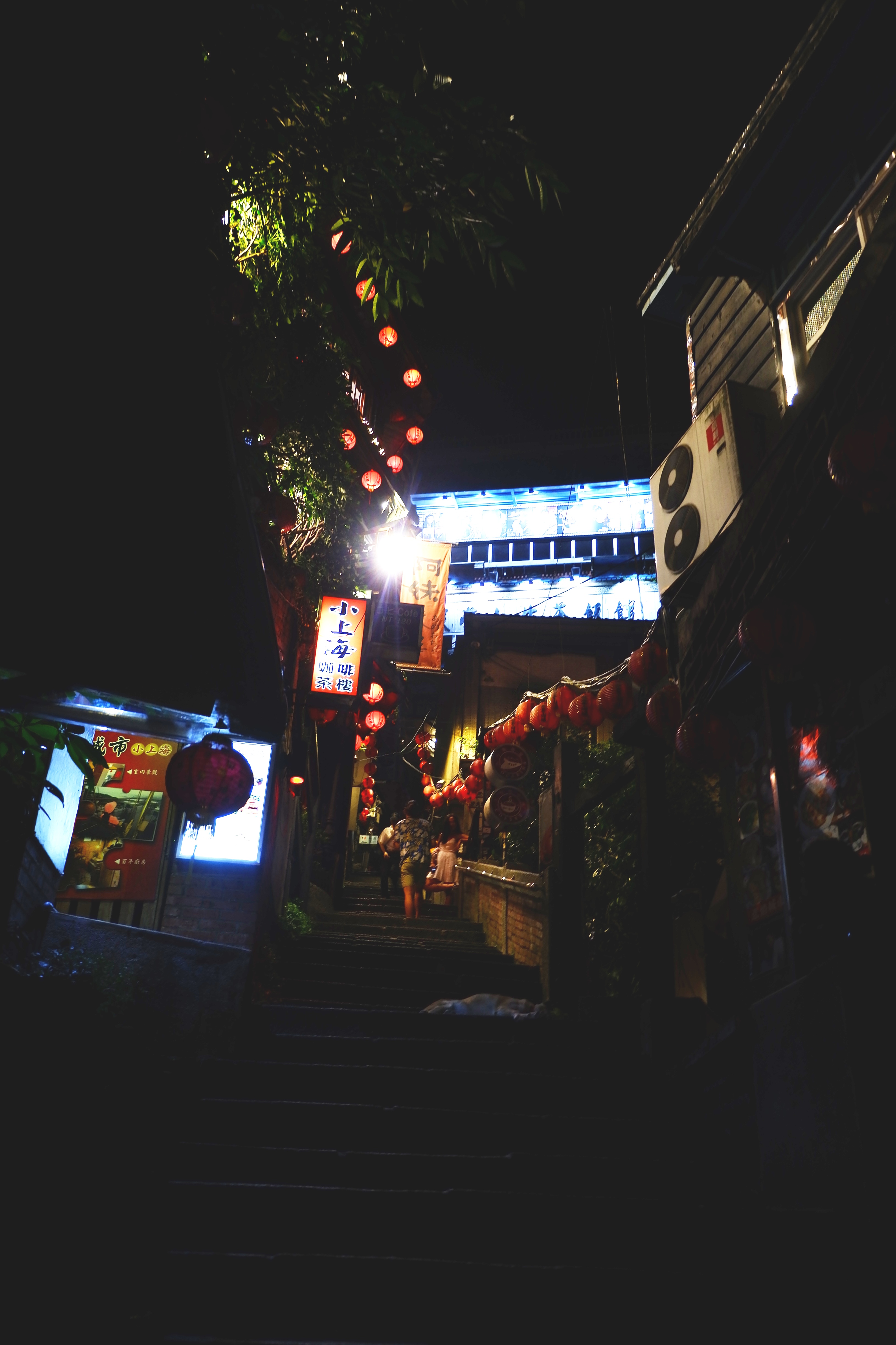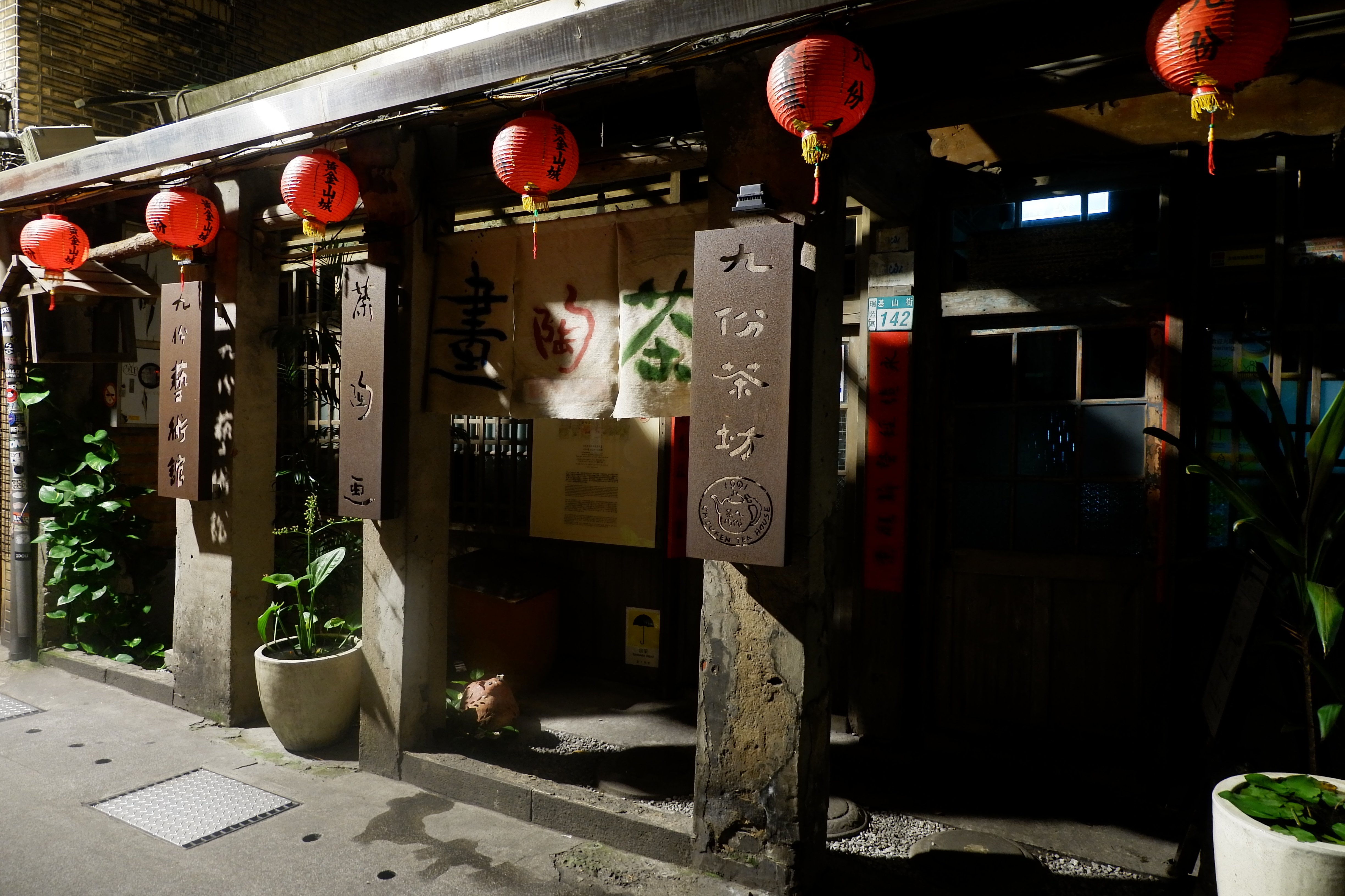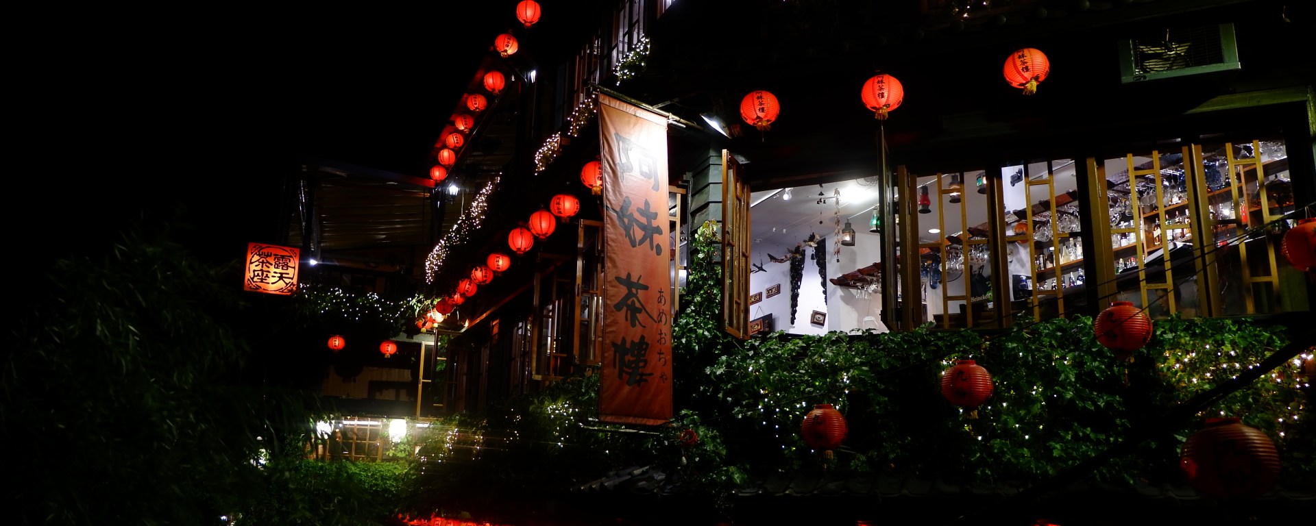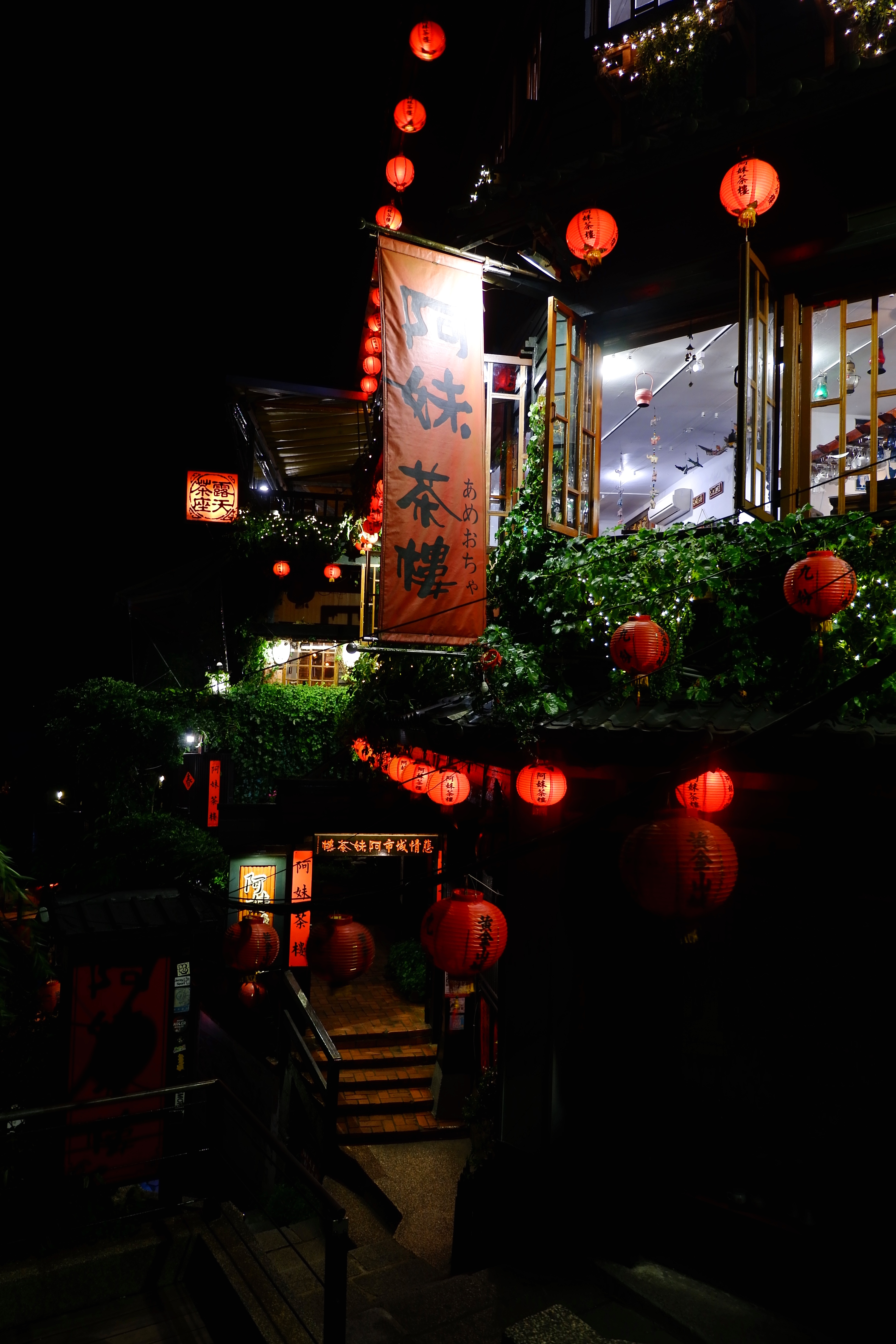 Toàn bộ ngôi làng Cửu Phần tất nhiên không thể đẹp đến mê hoặc như khung cảnh được dựng lên trong “Spirited Away”. Nếu như điều này khiến cho những tưởng tượng trước chuyến đi của bạn trở thành đôi ba phần thất vọng, thì con ngõ nhỏ qua “Quán Trà A-Mei” sẽ phần nào trả lại cho bạn chút niềm tin vào cuộc sống. Đó cũng là điểm dừng chân thứ hai của walking tour. Con ngõ nhỏ này là nơi duy nhất còn thắp những chiếc lồng đèn đỏ dọc theo lối đi vào buổi tối, bước xuống mỗi bậc thang đá lại có được một góc chụp khác nhau. “Quán Trà A-Mei” đứng sừng sững như một tòa lâu đài giữa những mái ngói nhỏ xung quanh, lại yêu kiều với giàn dây leo xanh xanh phía trước các khung cửa sổ gỗ.