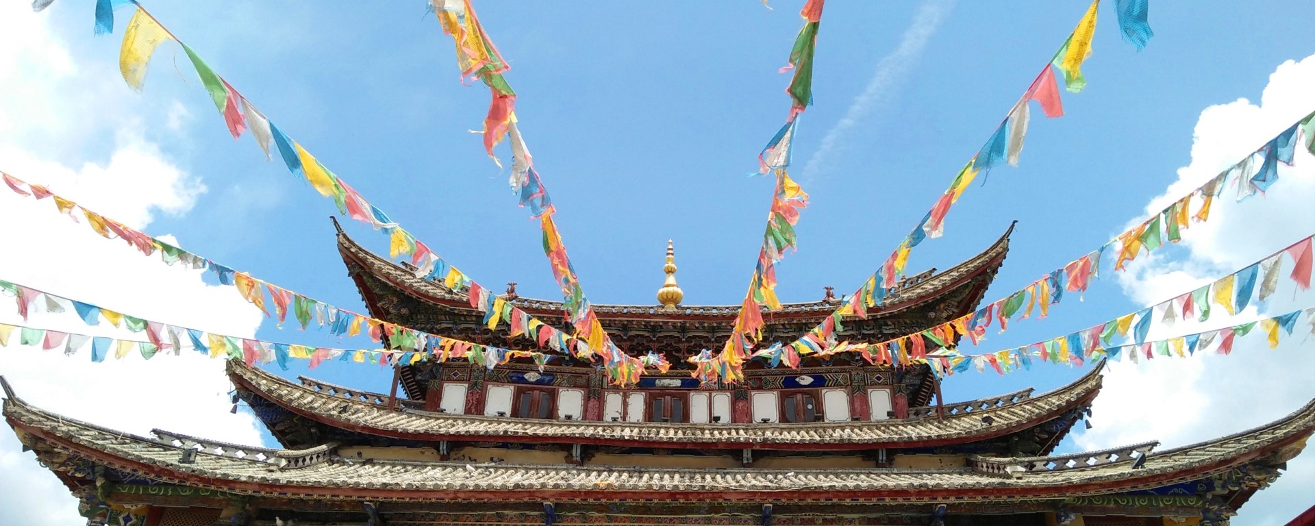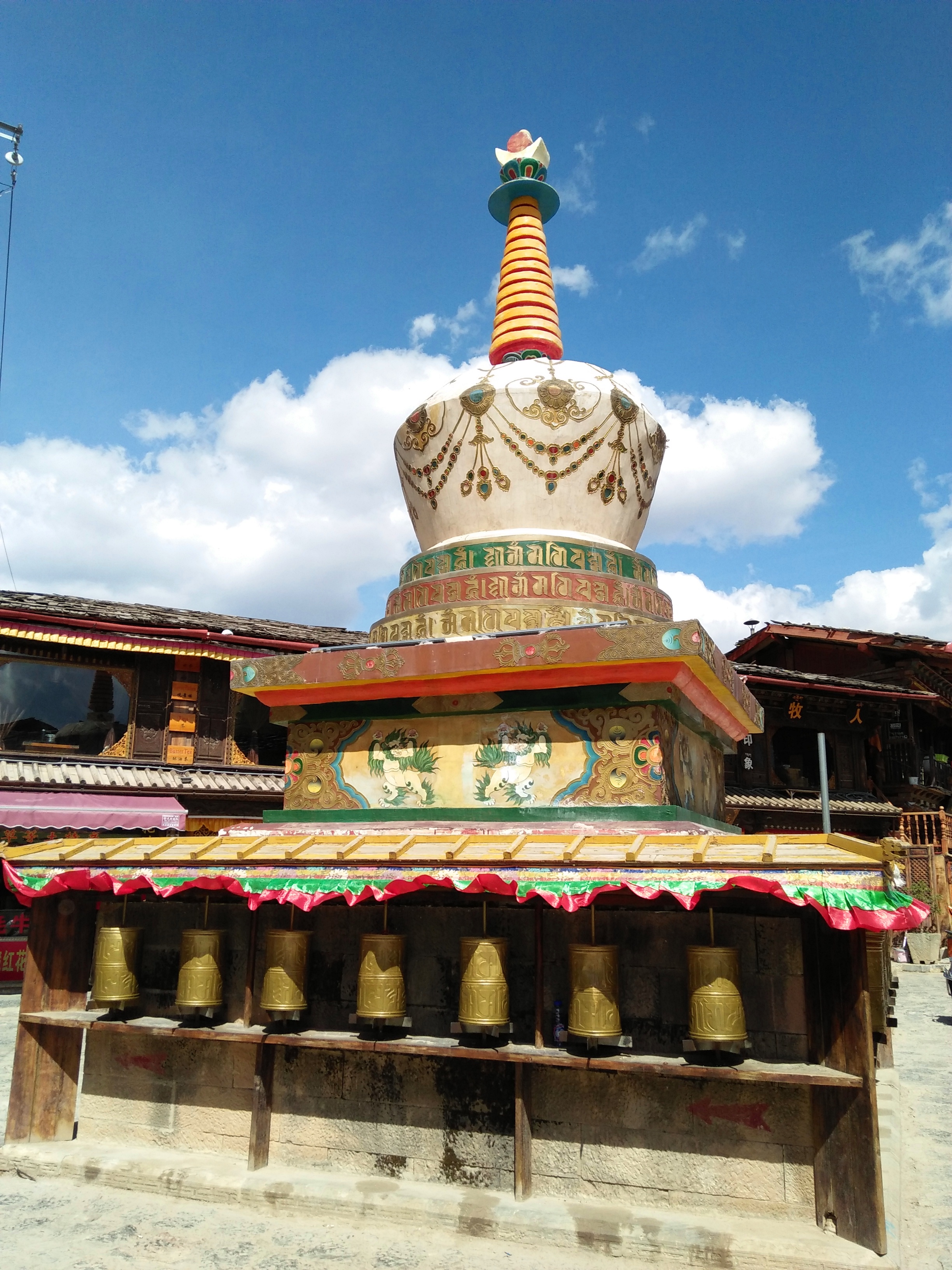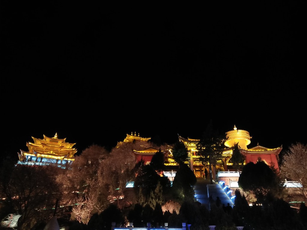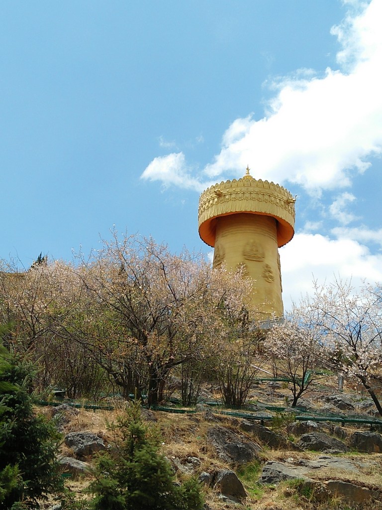 Ngay buổi tối đầu tiên đặt chân đến Shangri-La, chúng tôi hẹn nhau dạo phố cổ và lên thăm Đại Phật Tự. Ngôi chùa nổi tiếng nằm trên ngọn đồi giữa phố cổ, ban đêm toàn bộ khuôn viên được thắp đèn led rất lộng lẫy, có 4 màu sắc thay phiên nhau xoay vòng. Bên trong chùa người ta treo đầy những dây cờ Lungta dọc theo lối đi hoặc cuốn quanh một cột cờ cầu nguyện, trên mỗi lá cờ đều có in những hình vẽ linh vật và các dòng kinh Phật bằng chữ Tạng. Lungta có 5 màu sắc: Vàng, trắng, đỏ, xanh lá, xanh dương đại diện cho các nguyên tố tạo nên vũ trụ: Đất, Nước, Lửa, Khí và Không (bầu trời). Người Tạng tin rằng mỗi khi gió thổi tung các lá cờ Lungta, những lời cầu nguyện, kinh chú in trên cờ sẽ được gửi lên trời cao, cùng lúc, độ từ bi và phước lành cũng sẽ theo ngọn gió lan tỏa khắp nhân gian. Bên cạnh chùa là trụ kinh luân khổng lồ khắc đầy những câu thần chú bình an. Kinh luân trong Phật giáo Tây Tạng là một công cụ để luân chuyển linh hồn đến cõi tịnh độ thông qua câu thần chú Om Mani Padme HUm. Om Mani Padme HUm là câu thần chú đại từ đại bi của Quan Thế Âm, được in trong những tờ giấy lụa mỏng đặt bên trong các kinh luân. Người Tạng quan niệm rằng ở bên trong mỗi chiếc kinh luân in bao nhiêu dòng thần chú, thì khi xoay một vòng cũng giống như ta đã niệm được bấy nhiêu câu chú. Đại Phật Tự nằm trên ngọn đồi cao, lại có một trụ kinh luân khổng lồ bên cạnh đủ để thấy nó giữ một vị trí tâm linh quan trọng đối với vùng Địch Khánh.