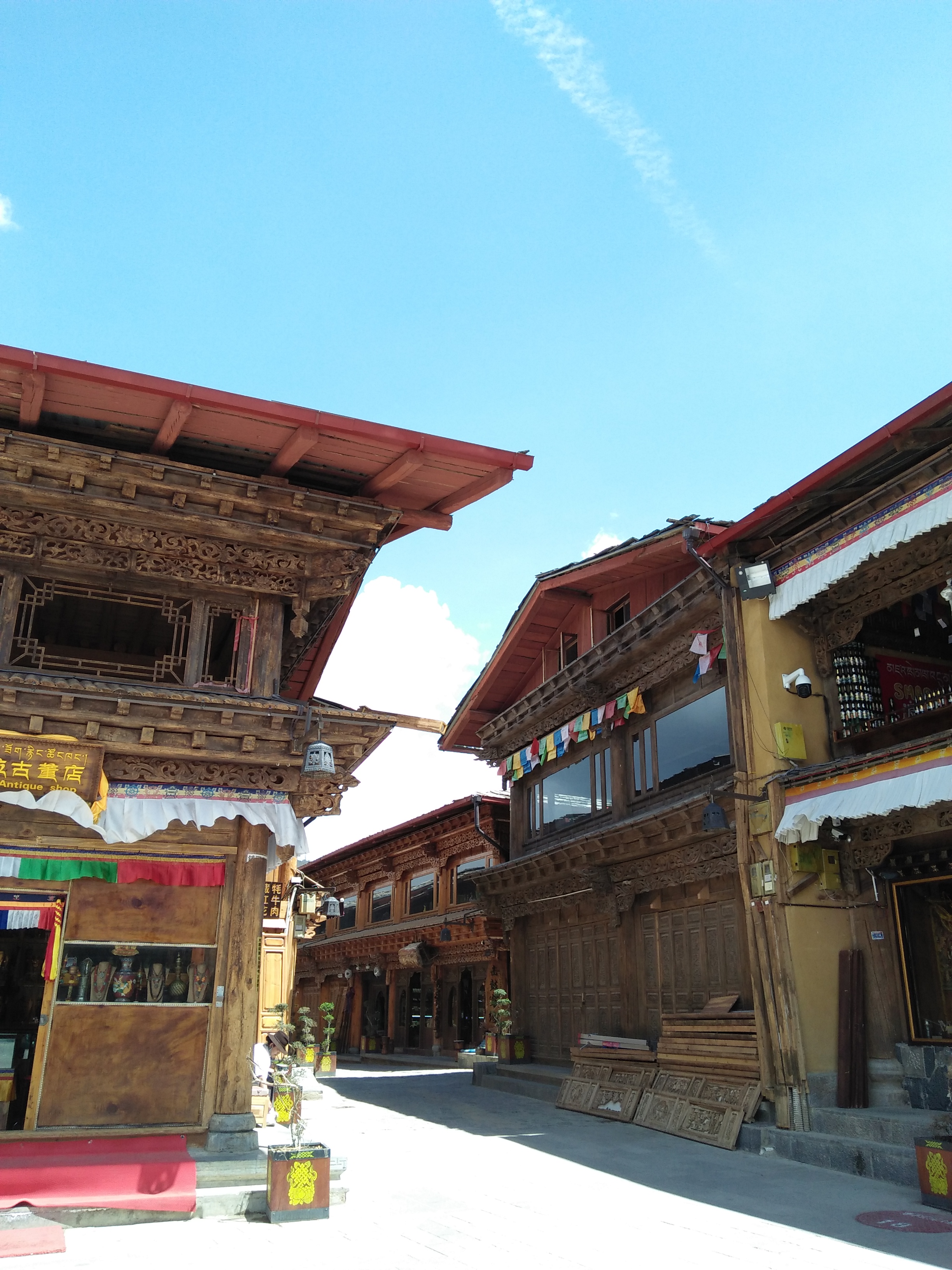 Và phố cổ Shangri-La, nơi những tiệm đồ lưu niệm không phải dãy phố nào cũng có, không phải mọi cửa hàng đều san sát bên nhau và thường chẳng con phố nào nườm nượp khách. Shangri-La ban ngày nắng vàng ấm áp, khách du lịch dạo quanh mấy dãy phố chọn đồ: những chiếc vòng đá, những chiếc móc cầu may được tết thủ công bằng các loại sợi nhiều màu bày lộn xộn trong một chiếc rổ đan tre giản dị, cho đến những trang sức bạc, những món đồ đắt tiền như tượng phật đúc bằng đồng hay bằng đá quý. Mỗi cửa tiệm chỉ một hai du khách ghé vào, quan sát ngắm nghía, dãy phố đông đếm đi đếm lại cũng không quá hai chục người. Là nơi có tiệm trà thảo mộc trái cây thơm thơm thanh thanh mỗi lần bước vào, những hộp trà bánh đóng sẵn với vỏ bìa là tên những cuốn sách, là những bức ảnh mang đậm nét Shangri-La, những chiếc bình thủy tinh trong suốt đựng cánh hoa, các loại quả sấy đã qua chế biến, chỉ cần ngâm vào nước ấm là có bình trà theo mùi vị yêu thích. Trà bán theo lượng mà khách hàng mong muốn, đóng vào từng gói giấy nhỏ xíu chỉ 10gram vừa đủ một lần pha, xinh xắn, vintage và anh bán hàng cứ thỉnh thoảng lại đóng thừa ra một chút mỗi gói. Một quảng trường nhỏ, một ngôi stupa màu trắng giữa khoảng ngã giao các con phố, bao quanh chân đế bởi những chiếc kinh luân nhỏ bằng đồng. Quán cà phê trên lầu 2 ở góc phố phát những bản nhạc hoài cổ, bàn kê gần cửa sổ gỗ, đệm lưng êm êm ngả người thư thái ngắm người đi ngoài phố, nhấp ngụm cà phê Vân Nam, đọc vài trang Tử thư Tây Tạng…