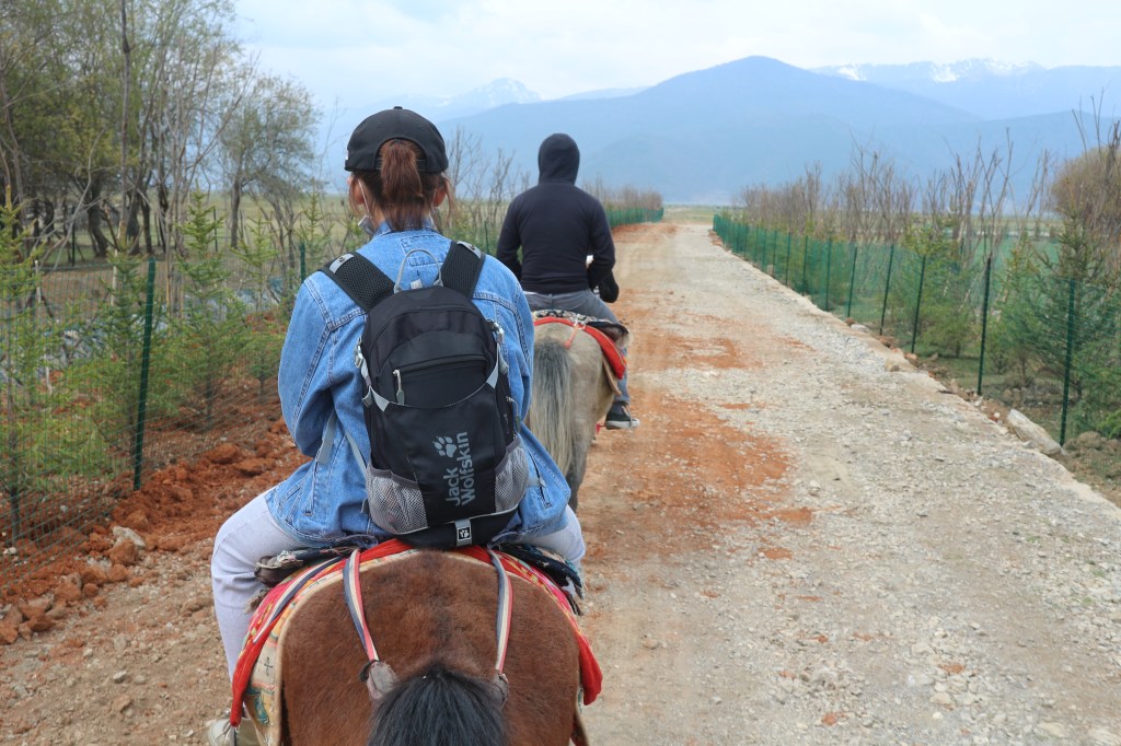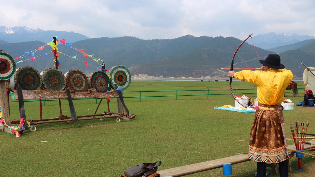 Đi hết xóm nhỏ, đoàn ngựa lại băng ngược qua đường quốc lộ để về bãi cỏ chân núi, đi theo con đường nhỏ có hàng rào ngăn giữa cánh đồng và khu bảo tồn. Bên phải là thênh thang cỏ xanh và đầm nước phía xa dù rằng mùa này hơi cạn, cùng với rặng núi dài sót lại chút tuyết trắng trên đỉnh. Bên trái, là cánh đồng màu vàng nâu nhạt, những cây lúa mì, tiểu mạch sau khi thu hoạch xong chất lên thành những cây lớn phơi nắng phơi gió hong khô. Cuối cùng, bầy ngựa cũng đã chạm chân tới ven hồ, nơi chúng có thể nghỉ ngơi gặm vài ngọn cỏ, uống miếng nước chờ đợi khách tự do tham quan, chụp ảnh và tham gia một số hoạt động du lịch do người dân địa phương cung cấp, có thể là tự phát và được phép tổ chức trong khu vực này: bắn cung, mượn đồ chụp ảnh theo phong cách Trung Quốc, hoặc đồ truyền thống của người Tạng… Giá dịch vụ ở đây rẻ, thậm chí trả tiền một lần, dùng lại 2-3 lần cũng không so đo chi. Bên đầm nước, mấy đàn chim bay đi trú đông đã kịp trở về, đậu trên mặt nước chỗ mỏ xuống tìm kiếm thức ăn, dưới nước chỉ có rong rêu và mấy con cá nhỏ xíu. Khi đó chỉ ước giá mình từng học qua cưỡi ngựa, thì cả thảm cỏ dưới chân có phải càng trở nên tự tại hơn không.