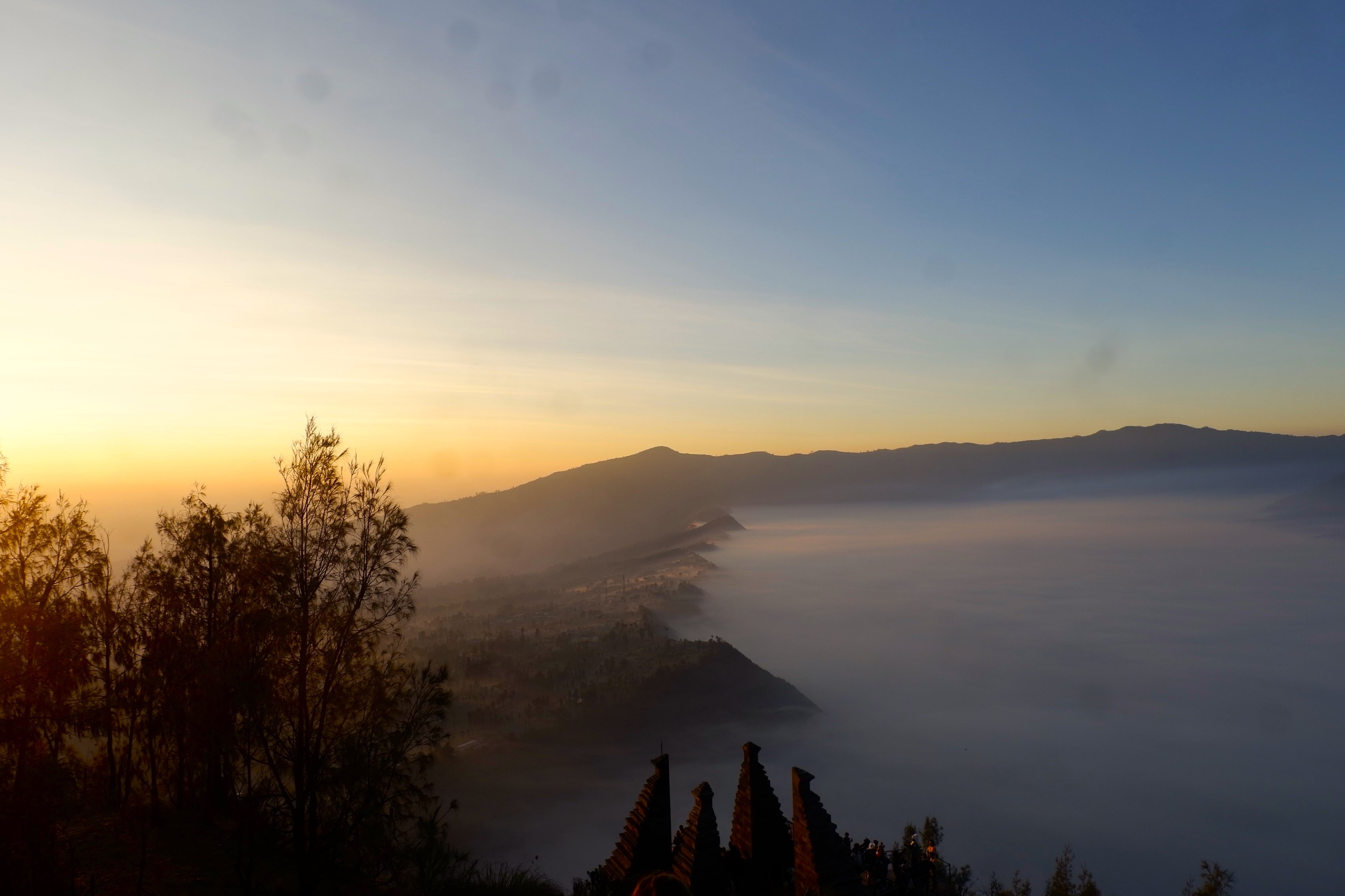 Thay vì leo lên đỉnh ngay khi trời tối, chúng tôi dừng lại ở một điểm lưng chừng đồi, nơi có thể nhìn rõ biển mây ngay bên sườn, ngồi đợi bình minh lên. Phía xa xa dưới chân đồi vẫn thắp những ánh đèn từ dãy nhà chạy dọc theo con đường chính trong thị trấn, nối nhau như sợi dây đèn led trang trí cây đào Tết. Chúng tôi không ai nói với nhau câu nào, mỗi người ngồi im một góc ngắm biển mây tan dần, Bromo và Semeru dần hiện rõ và bầu trời đang từ từ đổi màu từng phút, theo mỗi vầng sáng lên dần từ phía Đông.