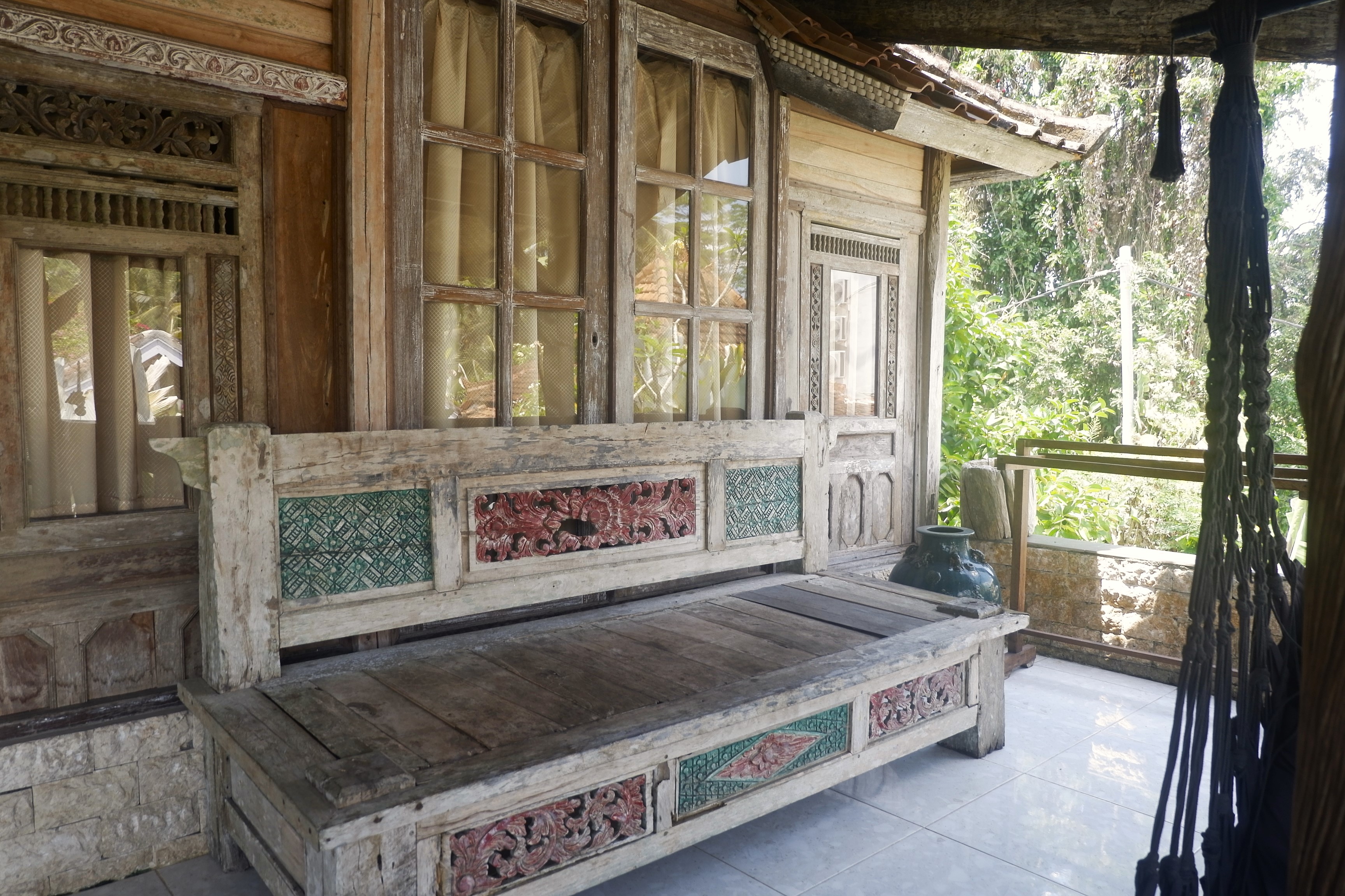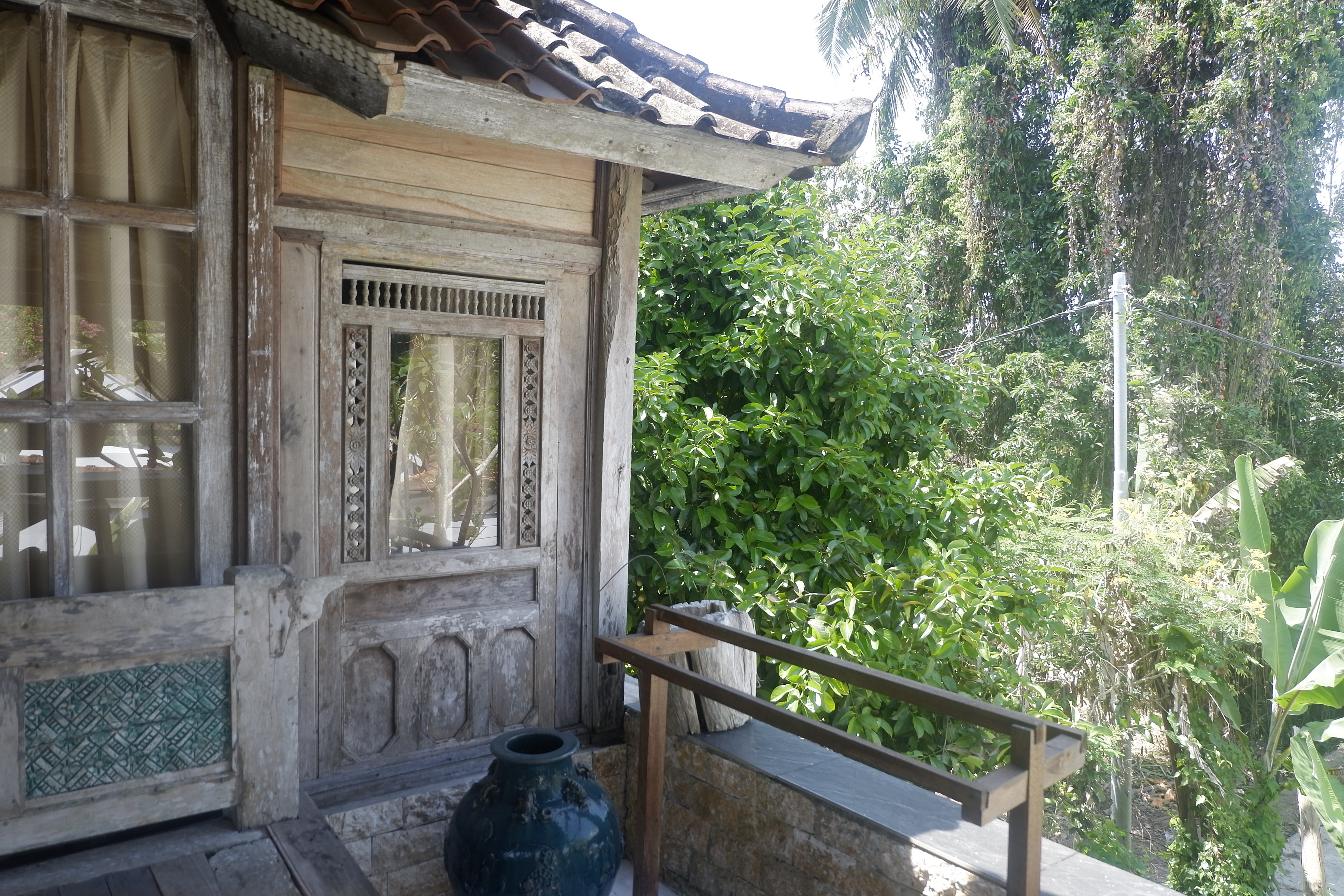 Phòng của tôi là một trong căn phòng trên gác hai của ngôi nhà gỗ cuối góc vườn (tôi không hỏi là hướng nào), bạn có thể tưởng tượng nó như một căn nhà sàn của người dân tộc Thái. Vốn được thiết kế cho hai người, căn phòng của tôi rộng thênh thang, bài trí đẹp như một căn bungalow của một boutique resort với những cánh cửa được chạm khắc hoa văn tỉ mỉ, lồng chụp đèn trong phòng, tủ gỗ để đồ, tủ đầu giường, thang treo khăn tắm và bàn uống nước mỗi thứ đều vô cùng mộc mạc. Ban công của ngôi nhà là nơi mà tôi yêu thích nhất, với chiếc trường kỷ bên cạnh cửa và một giá phơi đồ nhỏ, một chiếc ghế võng và một bàn cà phê cao bên lan can gỗ nhìn ra bụi chuối trước nhà. Tôi thích ngồi tại đó uống cà phê đọc sách hoặc nghe nhạc buổi sáng và uống bia buổi tối, có lúc nghe một chiếc podcast trước khi đi ngủ. Phần ban công giữa hai căn phòng cùng tầng có kê một kệ đồ với vài cuốn sách hướng dẫn du lịch và mấy món đồ trang trí địa phương. Tôi không có lời nào đủ để diễn tả về niềm yêu thích của mình đối với căn phòng này, hay bằng một cách nói khác, với việc được ở trong một căn phòng như thế, tôi có thể dành cả mười ngày trời ở Ubud có lẽ cũng chưa thấy đủ.