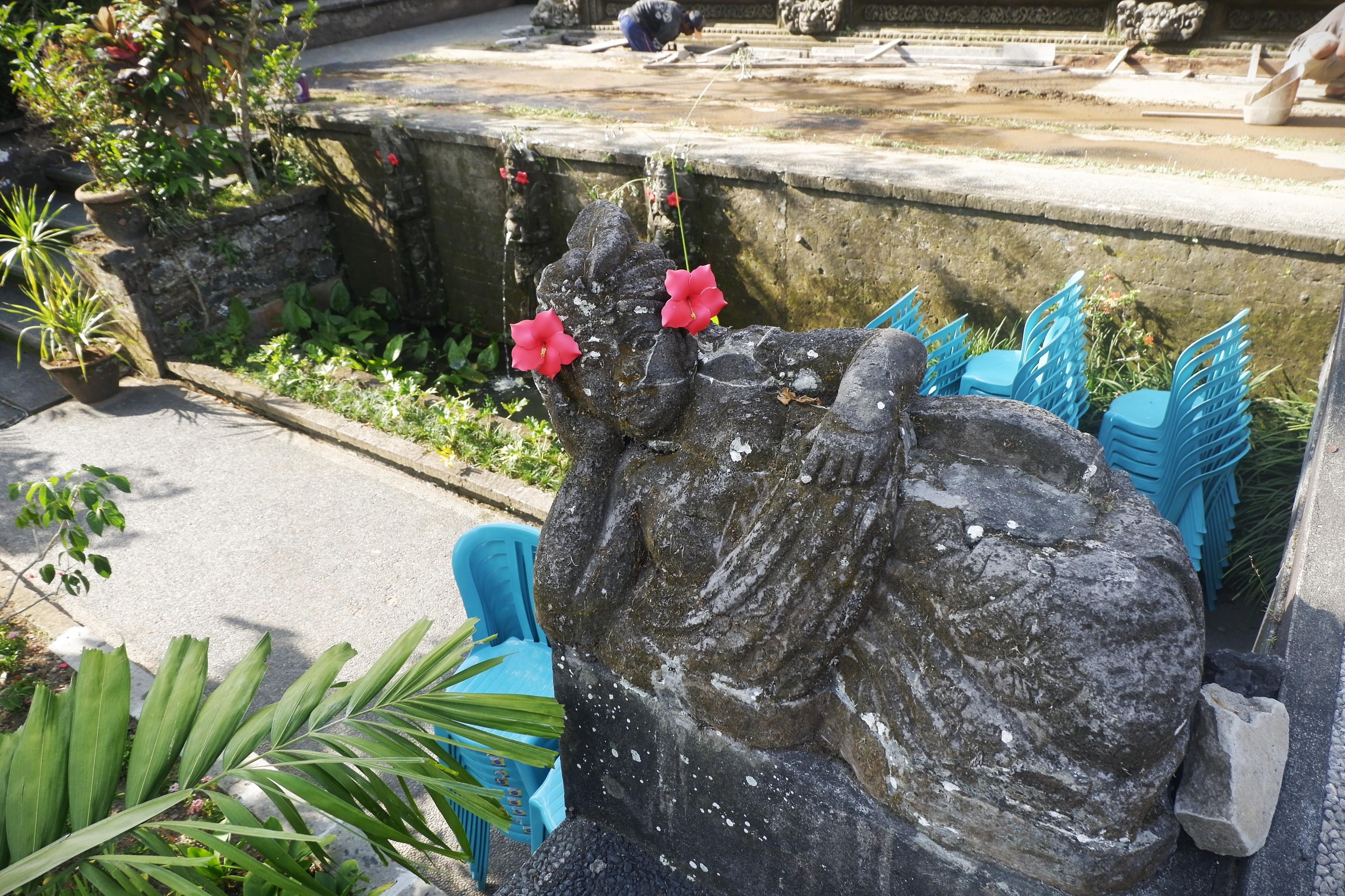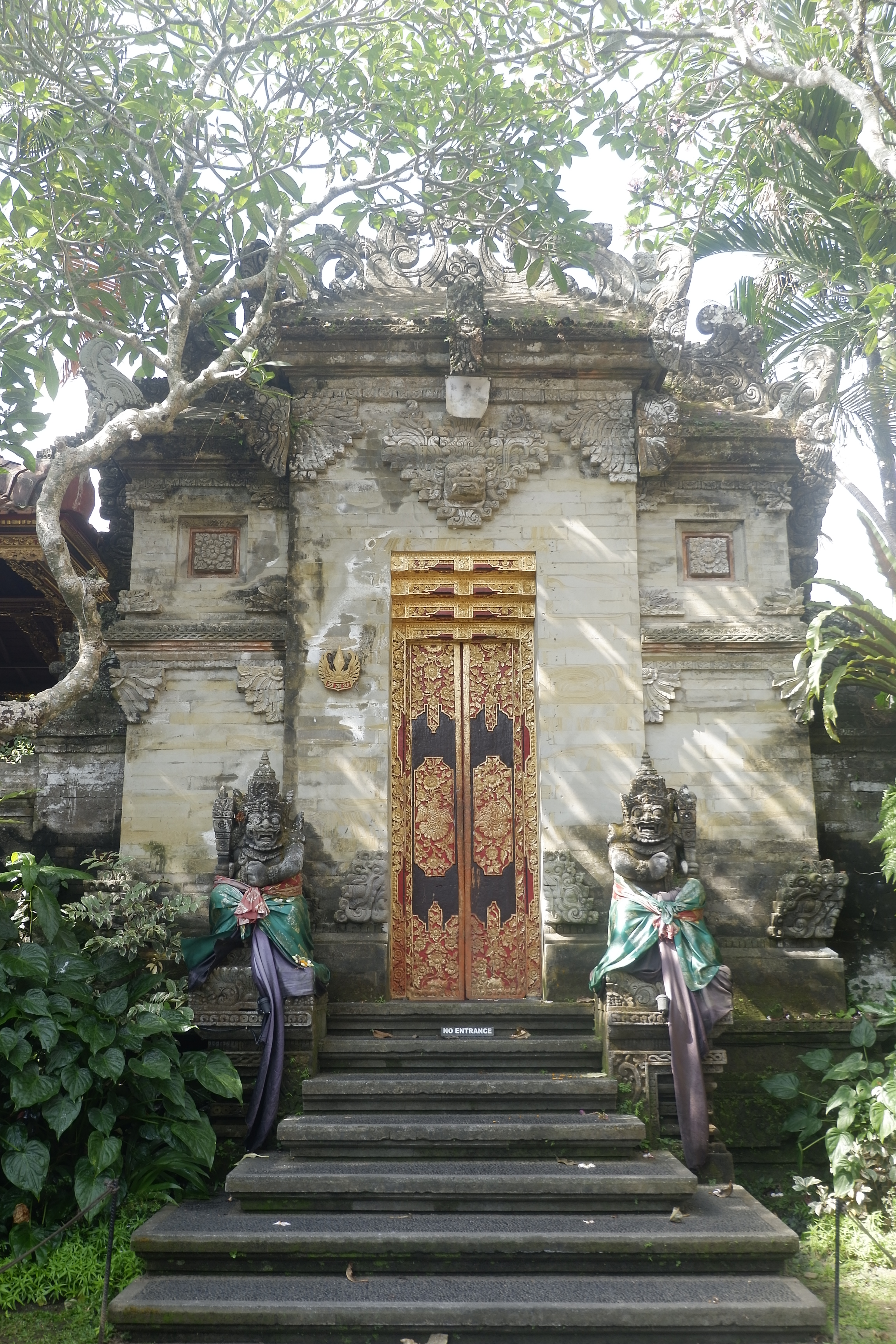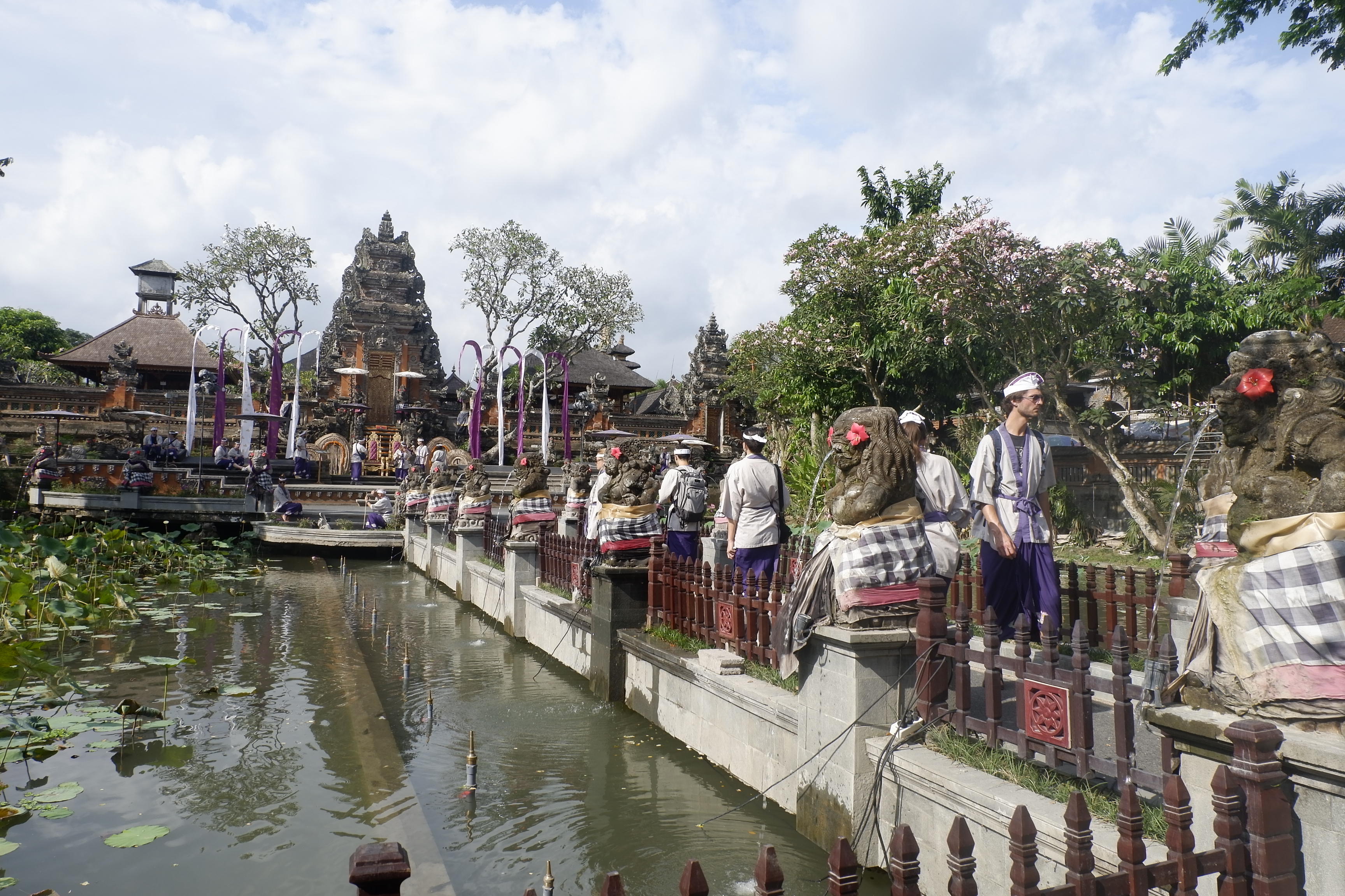 Chỉ cách đó hai con phố, Ubud Water Palace hay còn gọi với một cái tên khác, đền thờ Pura Taman Saraswati luôn là cái tên được tìm kiếm đầu tiên khi ai đó đến với Ubud. Ngôi đền hiện tại không được mở cửa toàn bộ mà du khách chỉ có thể tham quan khuôn viên chung trước đền với điểm nổi bật là một hồ sen lớn, ven hồ có trồng những cây hoa đại (Plumeria – frangipani) trang trí, còn lối vào đền chính là cây cầu thẳng xây ngang qua hồ và được trang trí bằng các tác phẩm điêu khắc các nhân vật thần thoại Hindu. Đền Pura Taman Saraswati thờ thần Saraswati, vị thần của tri thức và nghệ thuật, cũng là vị thần quan trọng nhất trong tín ngưỡng Hindu tại Ubud, tạo nên linh hồn của vùng đất này.
