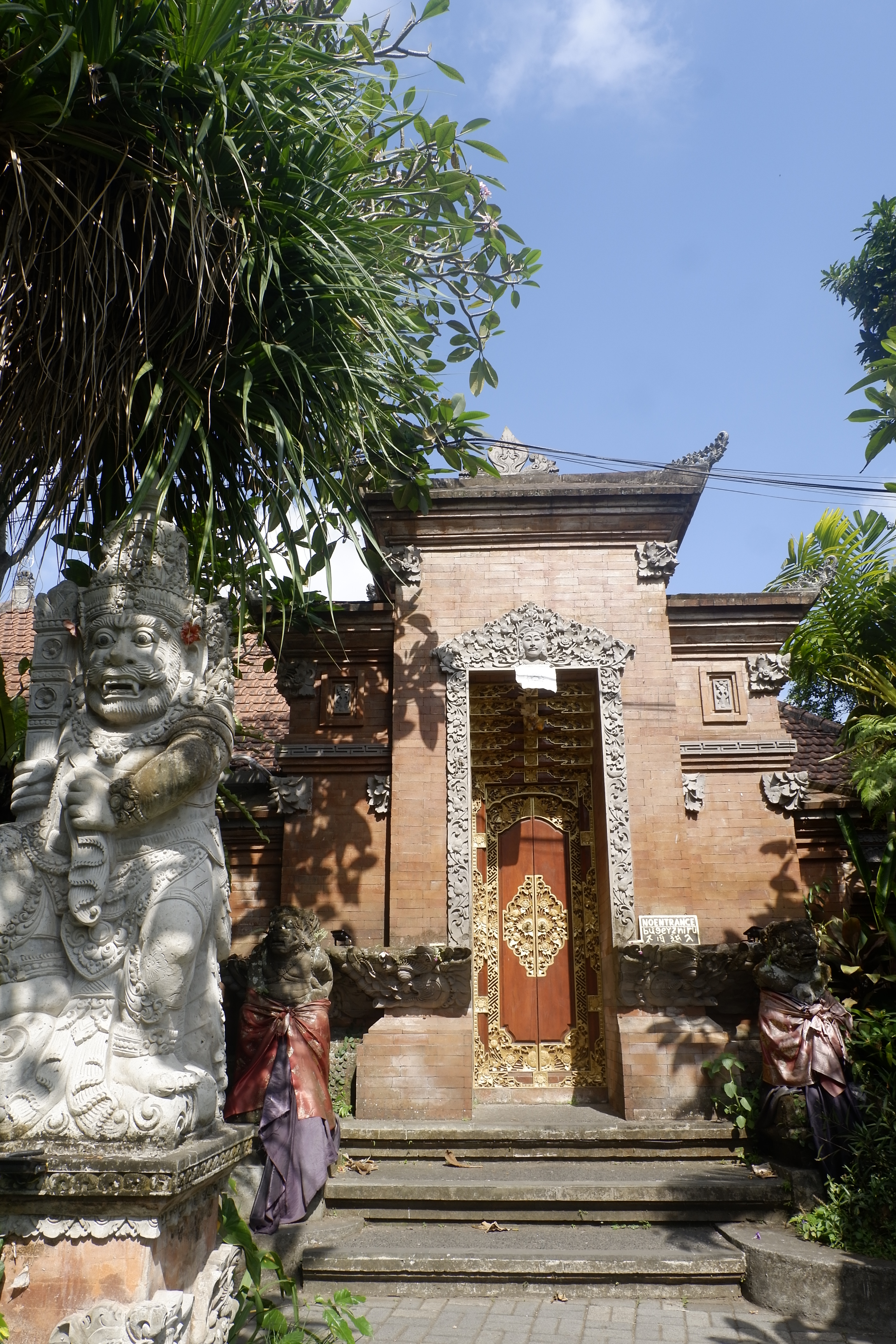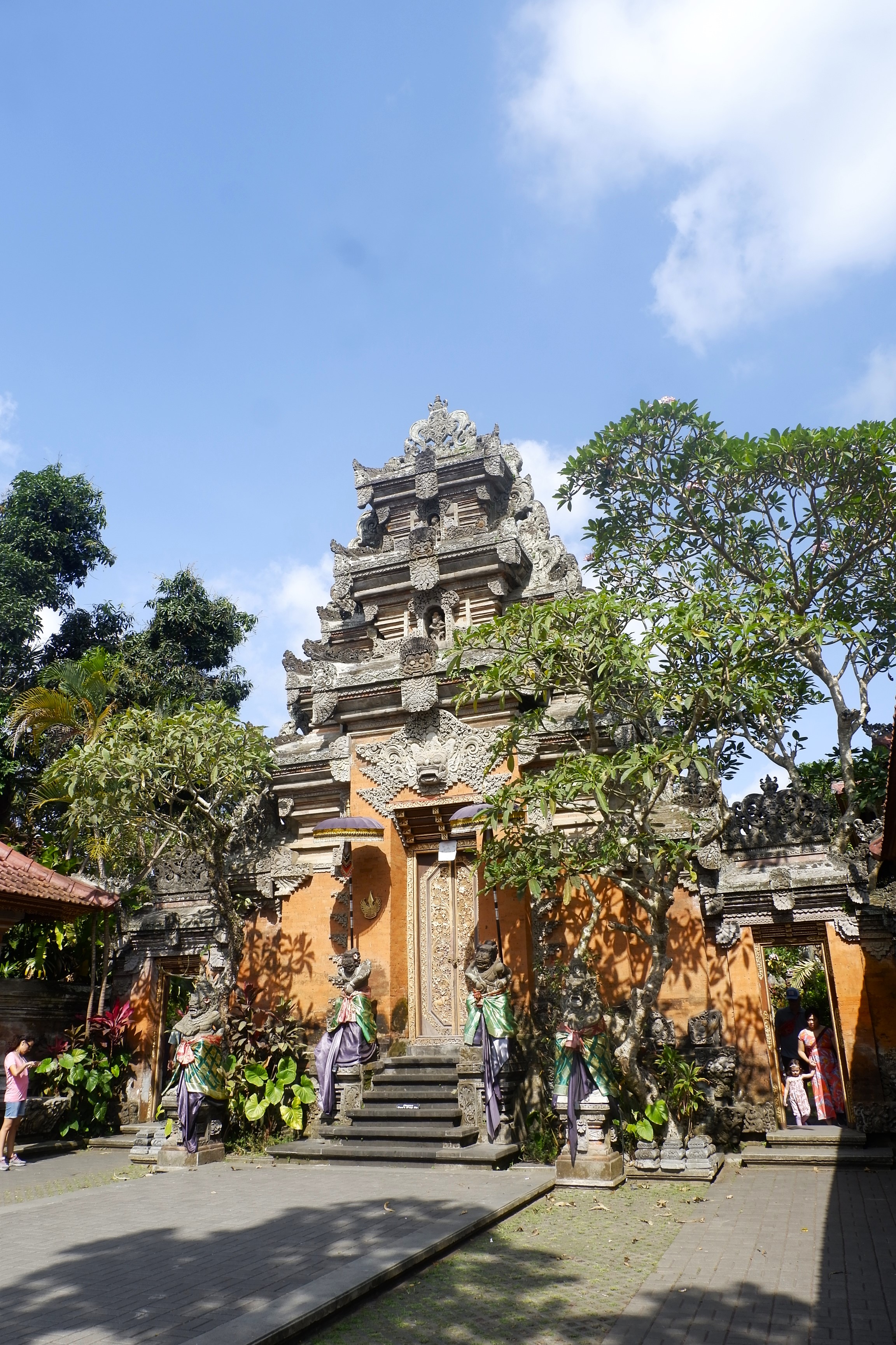 Trung tâm Ubud là một khu vực nhỏ chừng mười con phố đan vào nhau, bao quanh Ubud Palace và Pura Taman Saraswati – hay được gọi bằng một cái tên khác có vẻ dễ nhớ hơn là Ubud Water Palace. Trên những con phố và khu chợ ở trung tâm được gọi là Ubud art market, người ta bán các món đồ thủ công mỹ nghệ làm quà lưu niệm cho du khách. Về cơ bản, nó cũng không khác với các thị trấn du lịch khác là bao, với phần diện tích phù hợp để đi bộ, với những nhà hàng, quán xá, cửa tiệm phục vụ khách du lịch. Tôi để xe máy ở bãi để xe chung bên ngoài trung tâm, bãi để xe nền đất rộng bằng một sân bóng, không có bảo vệ, không có dịch vụ trông giữ xe nào, cũng đồng nghĩa với việc không lo bị mất. Sau khi đã ghi nhớ vị trí để xe, tôi đi bộ vào trong phố, đi loanh quanh tìm một nhà hàng ăn bữa lỡ buổi sáng lúc hơn 10 giờ, xong mới bắt đầu lịch trình ngày mới với Ubud Palace.