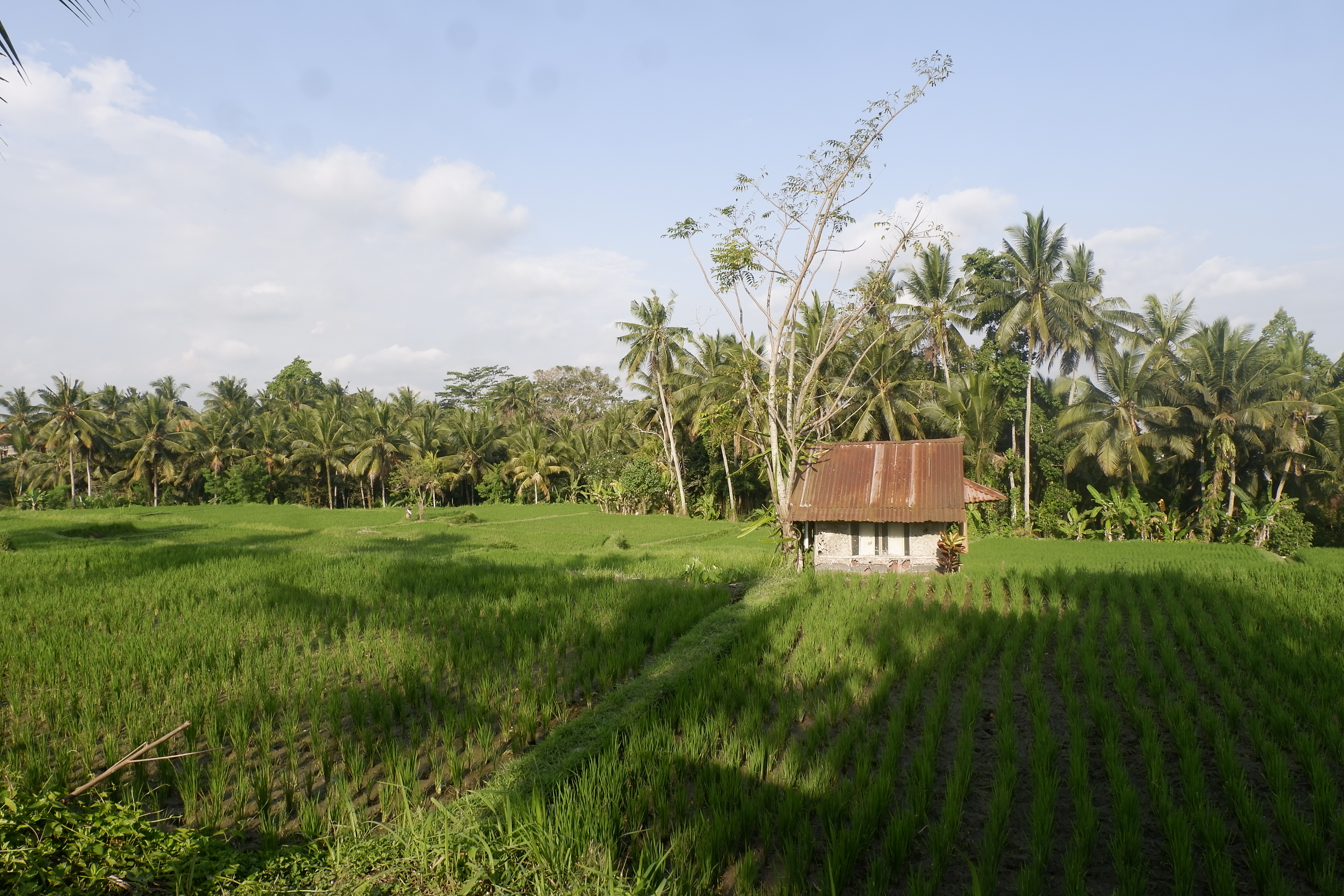 Ubud có một điều đặc biệt hơn so với các thị trấn du lịch khác, đó là bạn có thể chuyển cảnh tức thì chỉ với vài bước chân, vài bước xuống phố, vài bước ra tới cánh đồng, và vài bước nữa liền đi lạc vào rừng. Nếu bạn để ý trên bản đồ, dọc con đường chính chạy xuyên qua thị trấn, phía sau Ubud Water Palace nếu đi theo hướng từ trung tâm ra, là cơ số những ngách rẽ nhỏ dẫn ra những cung đường đi bộ ở những cánh đồng bên rìa thị trấn. Những ngõ rẽ đôi khi nhỏ đến mức nếu không có bảng chỉ dẫn hoặc không thật chăm chú vào bản đồ, bạn sẽ đi lướt qua nó nhiều lần trên con phố chính tấp nập du khách. Những ngõ rẽ nhỏ mà chỉ với vài bước chân xuyên qua nó, trước mặt bạn sẽ là những hàng dừa hàng cọ thẳng tắp, những thửa ruộng bậc thang đang thời xanh lúa, hay những ngọn đồi thoải mà phía xa kia mặt trời đang chuẩn bị tan ca.
