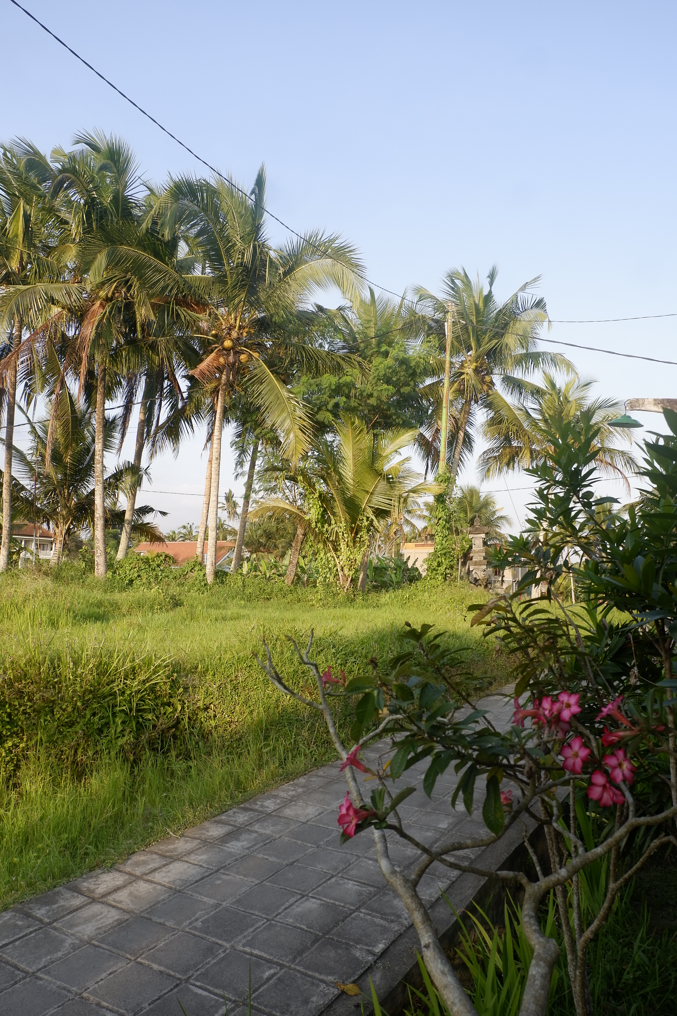 Xe chạy êm ru trên con đường nhựa giữa rừng cọ, như trong trailer của bộ phim “Eat, Pray, Love”, những hình ảnh xinh đẹp và hấp dẫn nhất về một hòn đảo nhiệt đới. Cùng với việc chưa đọc sách trước chuyến đi, tôi cũng chỉ mới xem qua trailer của bộ phim chứ chưa xem toàn bộ nội dung, và bởi vậy tôi không có ý định sẽ ghép Bali trong cuốn sách, một vùng đất mang đậm màu sắc tâm linh, với Bali của một chuyến du lịch ngắn ngày vào chung và bắt chúng phải khớp với nhau. Ban đầu, trong cái lịch trình mà chỉ viết ngày tháng và địa điểm mà không có nội dung chi tiết của mình, tôi để Ubud 3 đêm, sau đó, đến khi tìm đặt phòng nghỉ, tôi chỉ đặt trước hai đêm, để chừa lại một đêm linh động. Thế nhưng, những hình ảnh đang lướt qua bên ngoài khung cửa sổ nói với tôi rằng nếu có thể dành thêm một chút thời gian bên ngoài những điểm tham quan hay những trung tâm thị trấn nhộn nhịp, thì có thể bạn cũng sẽ tìm thấy được Bali trong cuốn sách ở một đâu đó giữa những thửa ruộng bậc thang, những mái nhà xen lẫn các ngôi đền Hindu dưới bóng cọ.