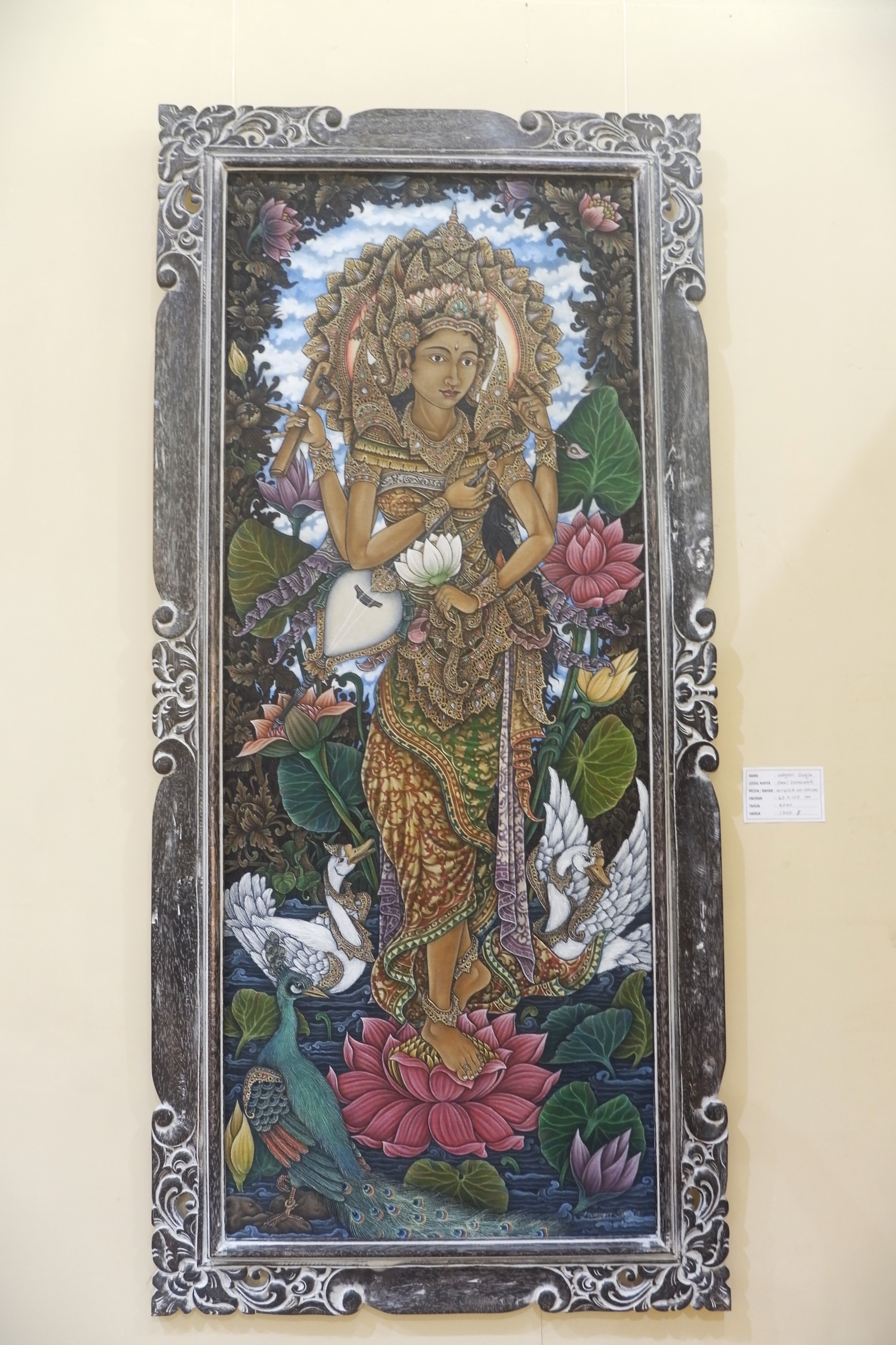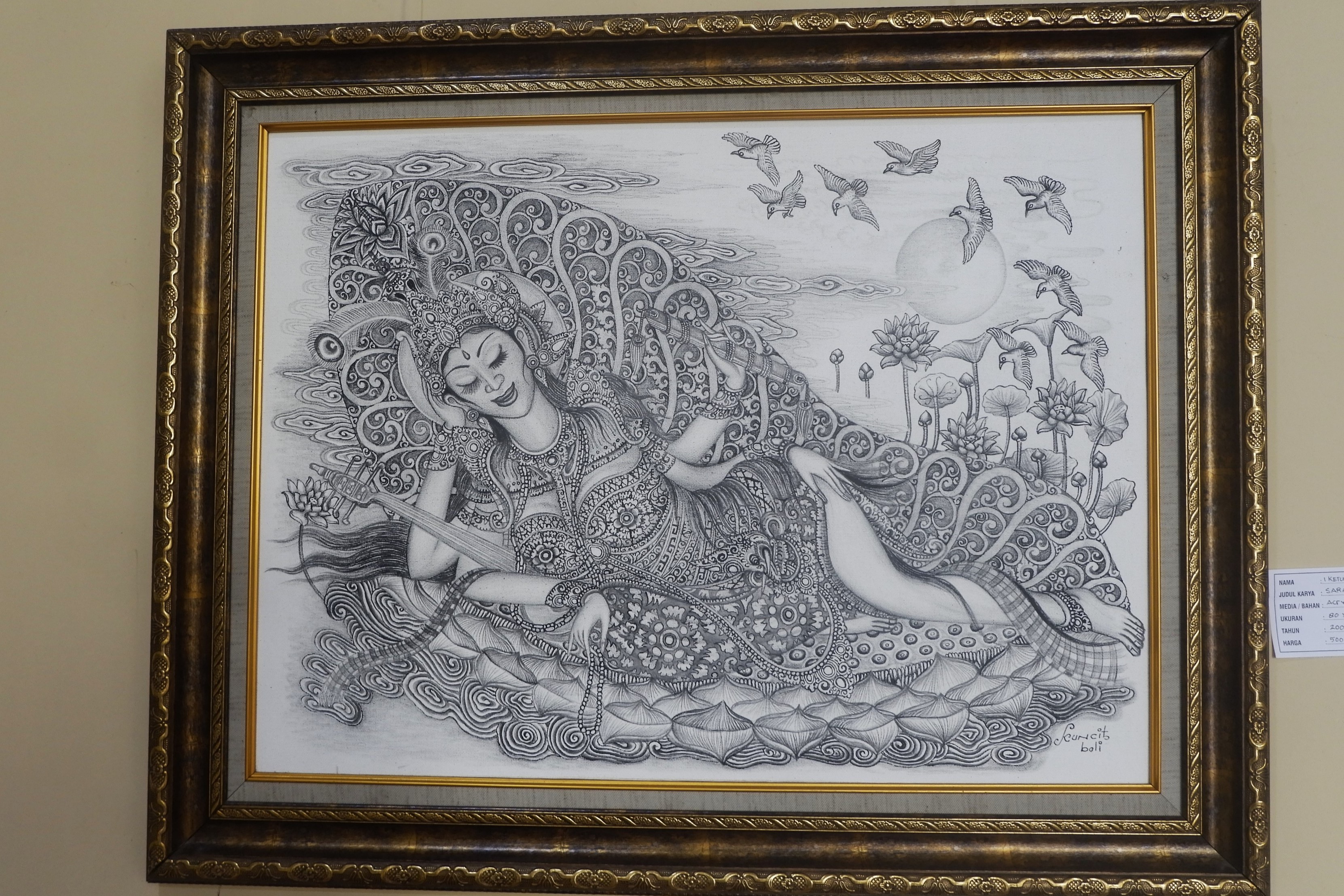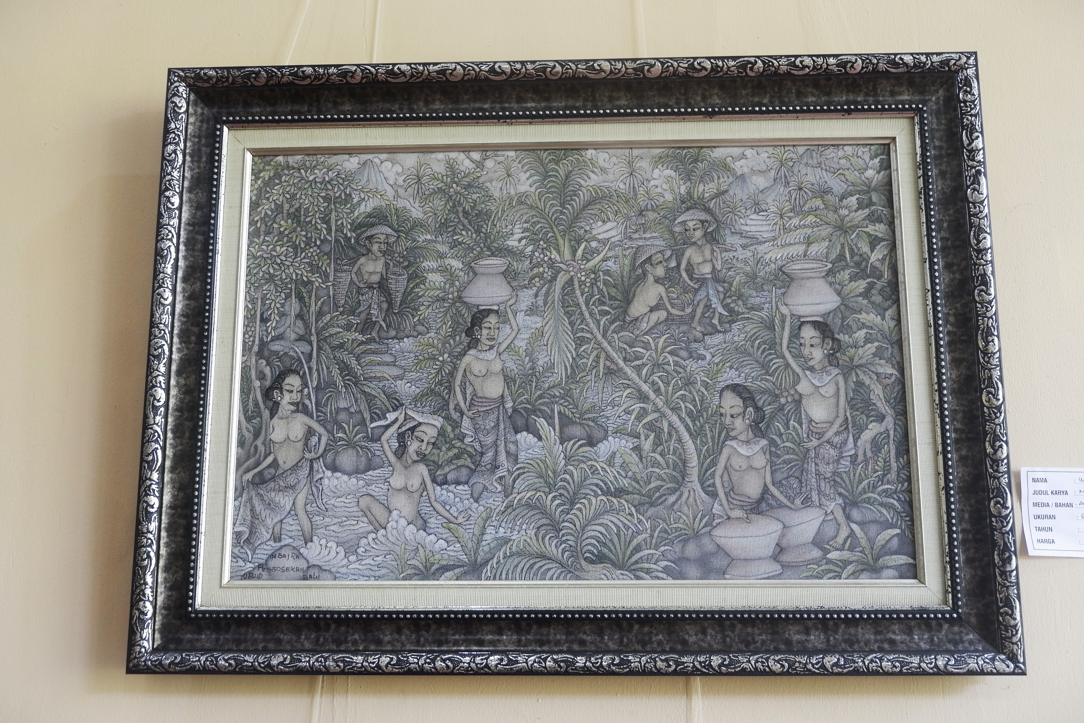Tại một góc của Ubud Monkey Forest có một phòng trưng bày tranh và các tác phẩm nghệ thuật của các nghệ sĩ tại Ubud, nơi mà người ta có thể tìm thấy những bức tranh vẽ, phù điêu… với các mức giá chỉ từ hơn một trăm cho tới hàng ngàn đô la. Trong số những bức tranh treo hôm đó, thu hút tôi nhất là những bức họa thần Saraswati, bức nào cũng đẹp mê mẩn, không hổ danh là vị thần của tri thức và nghệ thuật.