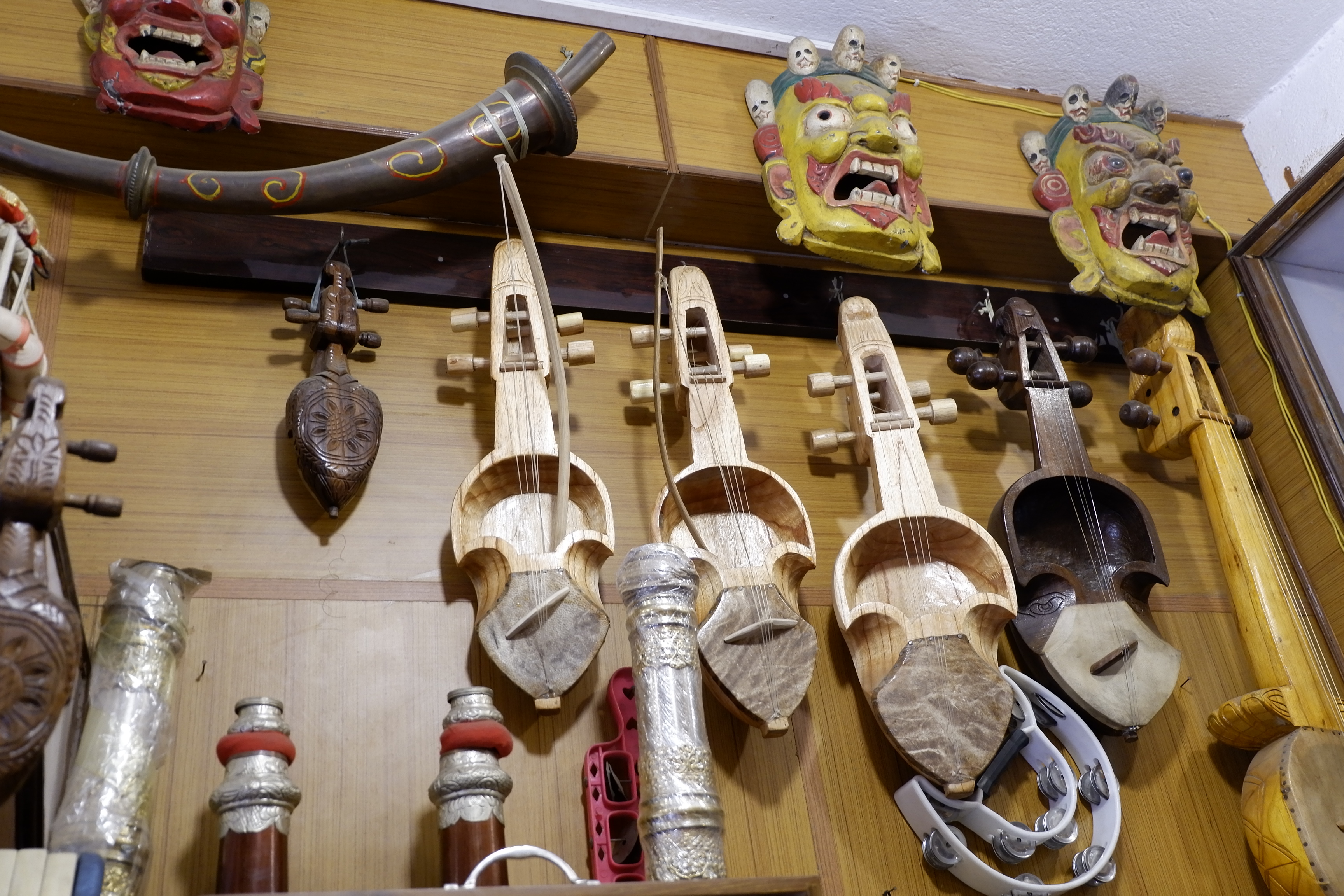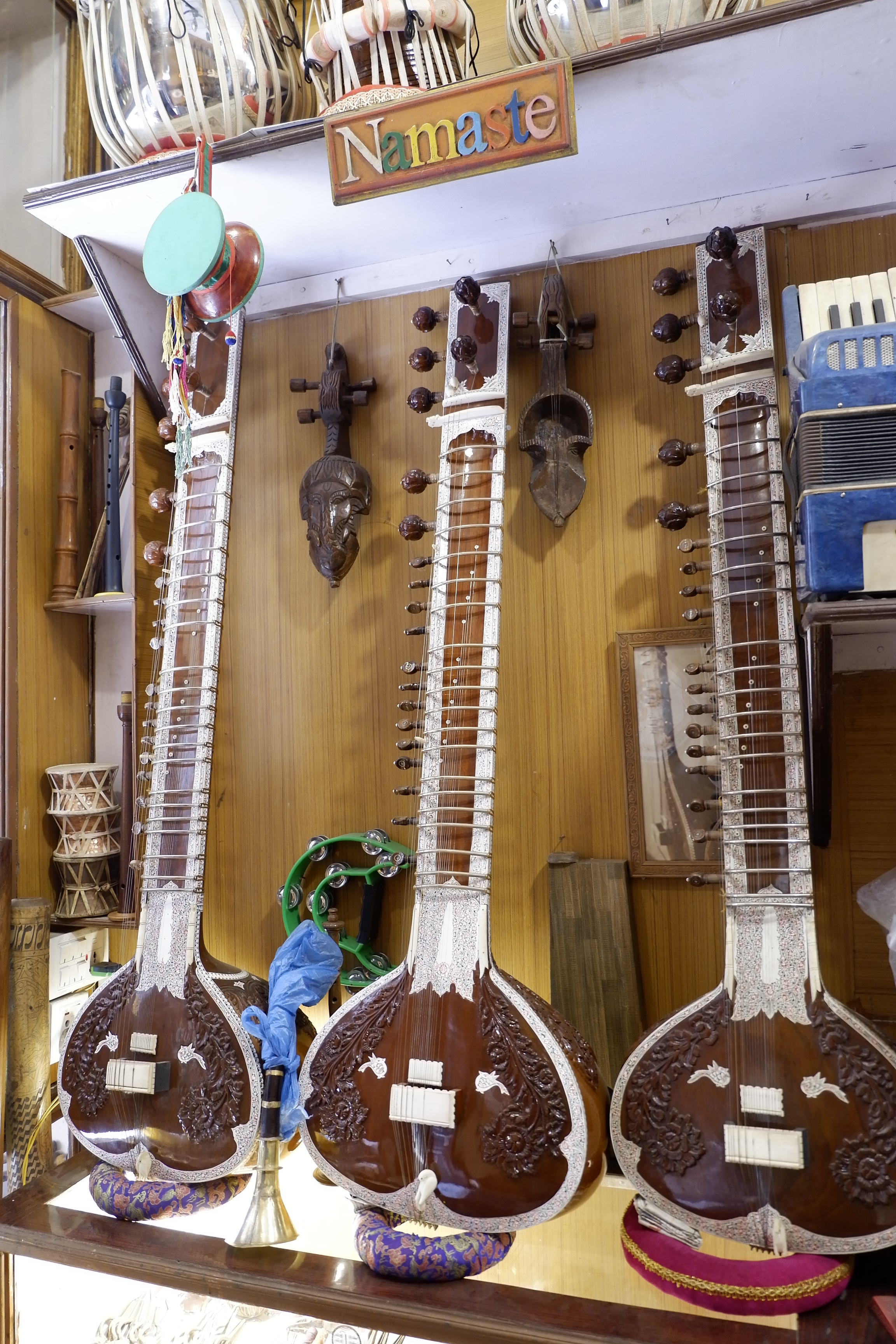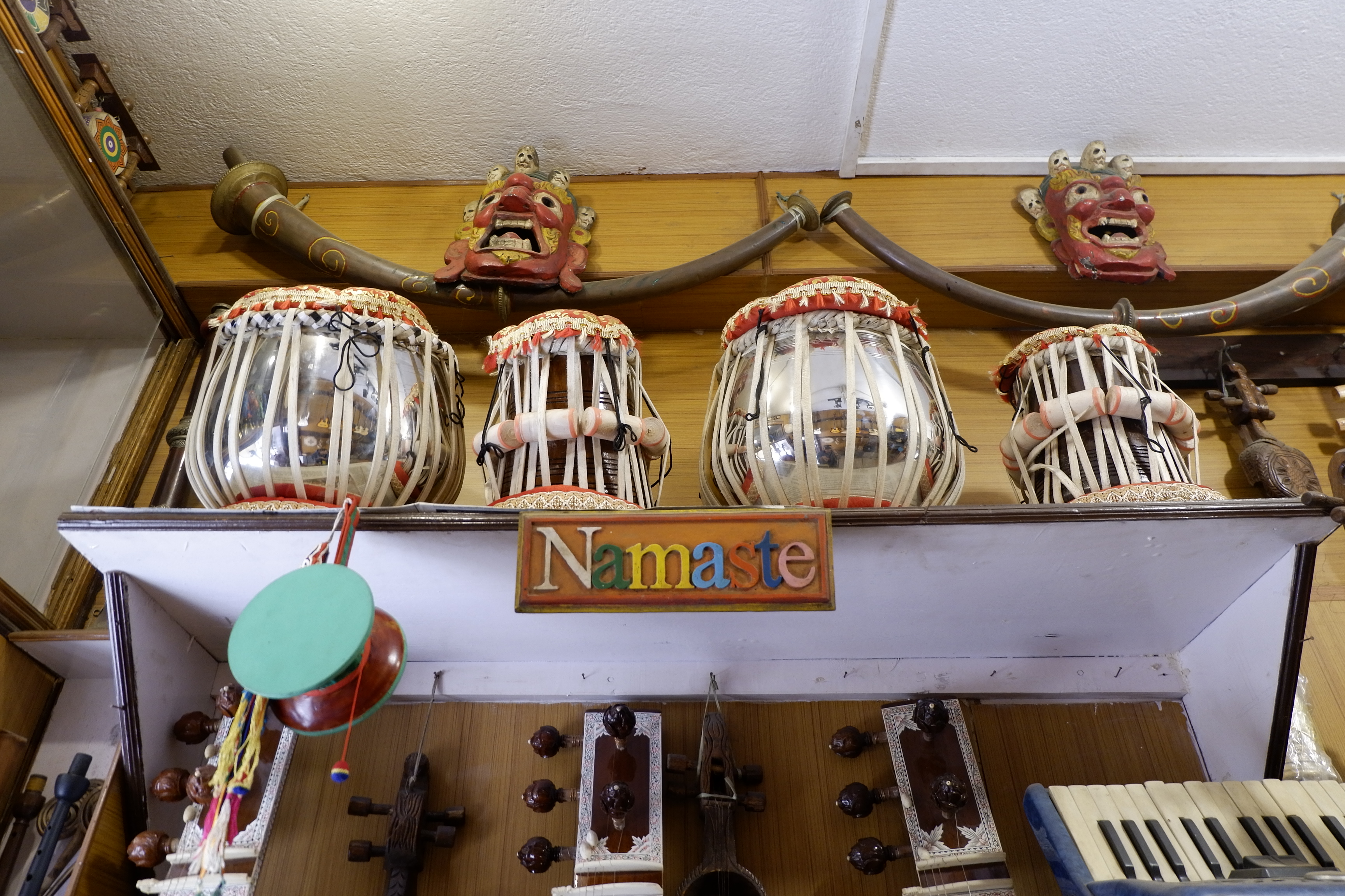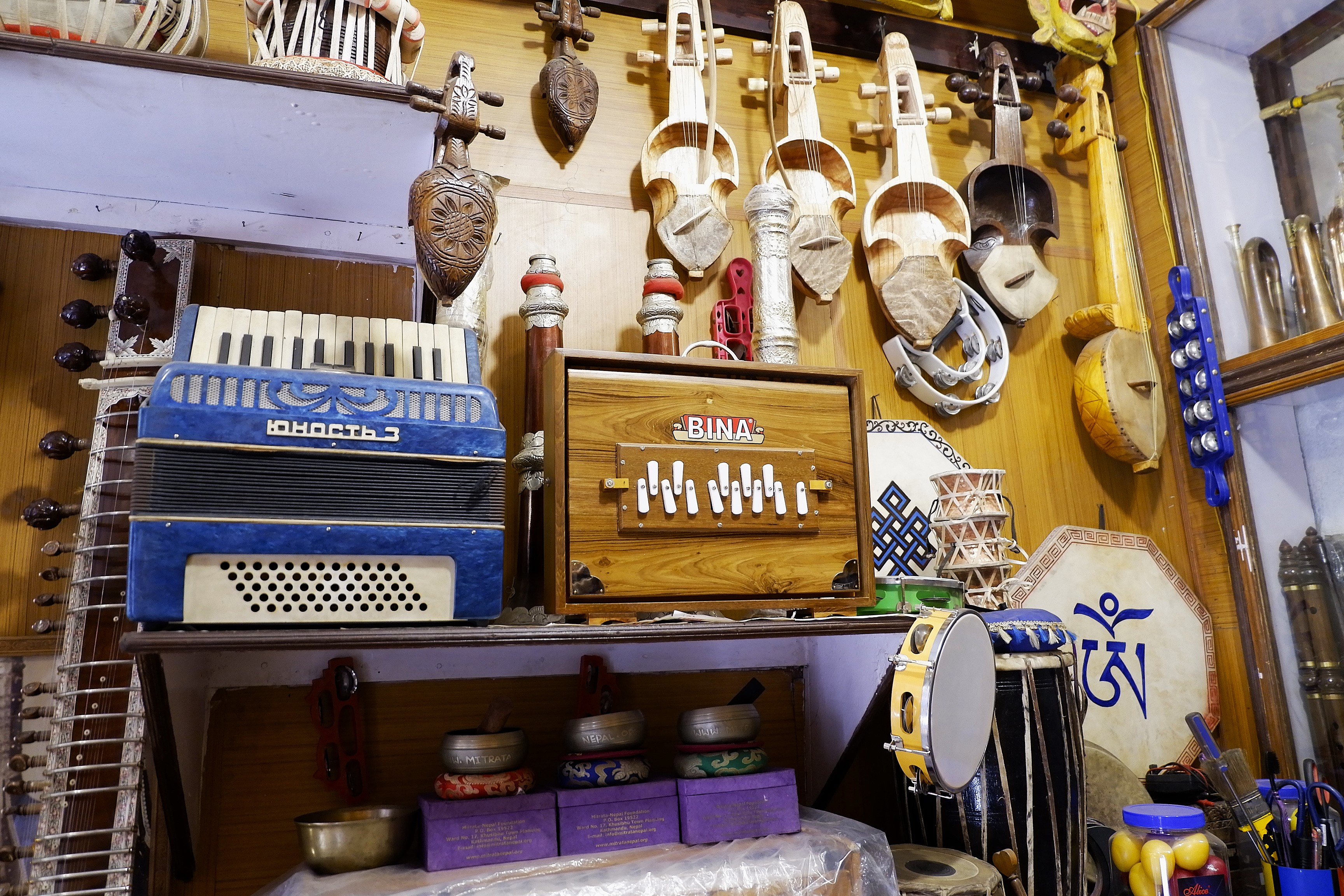 Tôi ghé vào một tiệm trưng bày và bán các loại nhạc cụ, đồ lưu niệm Nepali trên đường về nhà. Tôi luôn có một sự tò mò với âm nhạc, âm thanh, mặc dù chẳng hiểu gì về nó. Nepal có một số loại nhạc cụ dân gian bộ dây, nổi bật nhất là Sitar và Sarangi, và mấy loại trống vỗ mà tôi đã nhìn thấy họ chơi trong buổi lễ trước đó tại Bhaktapur, phát ra những âm thanh mang đậm màu Hindi. Đứng đây lại nghĩ, may mà tôi nghèo, chứ nếu không thì lại phải xách một món về làm kỷ niệm. Haha