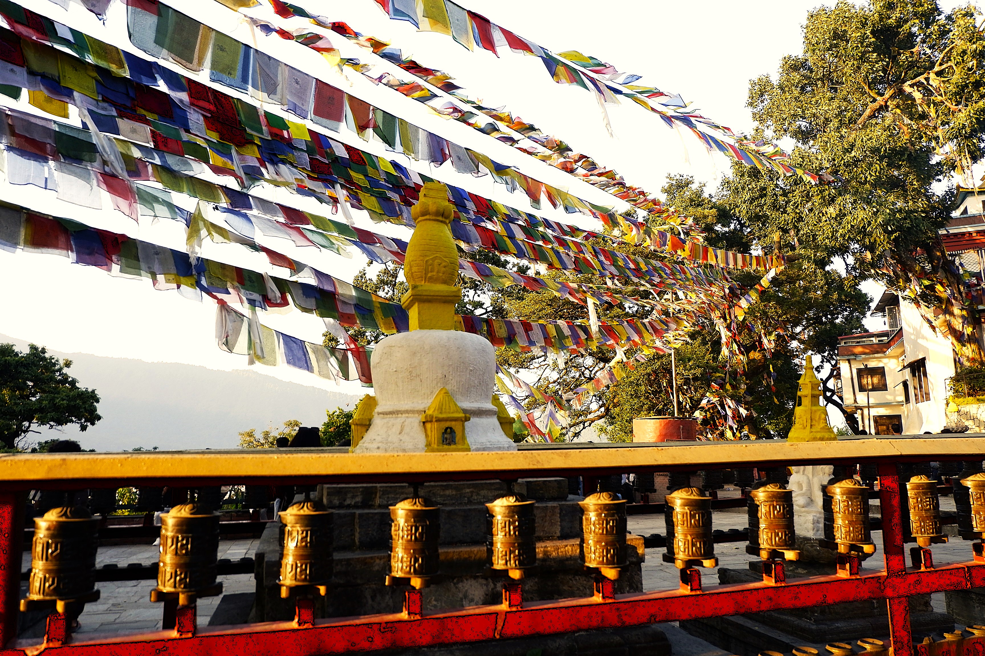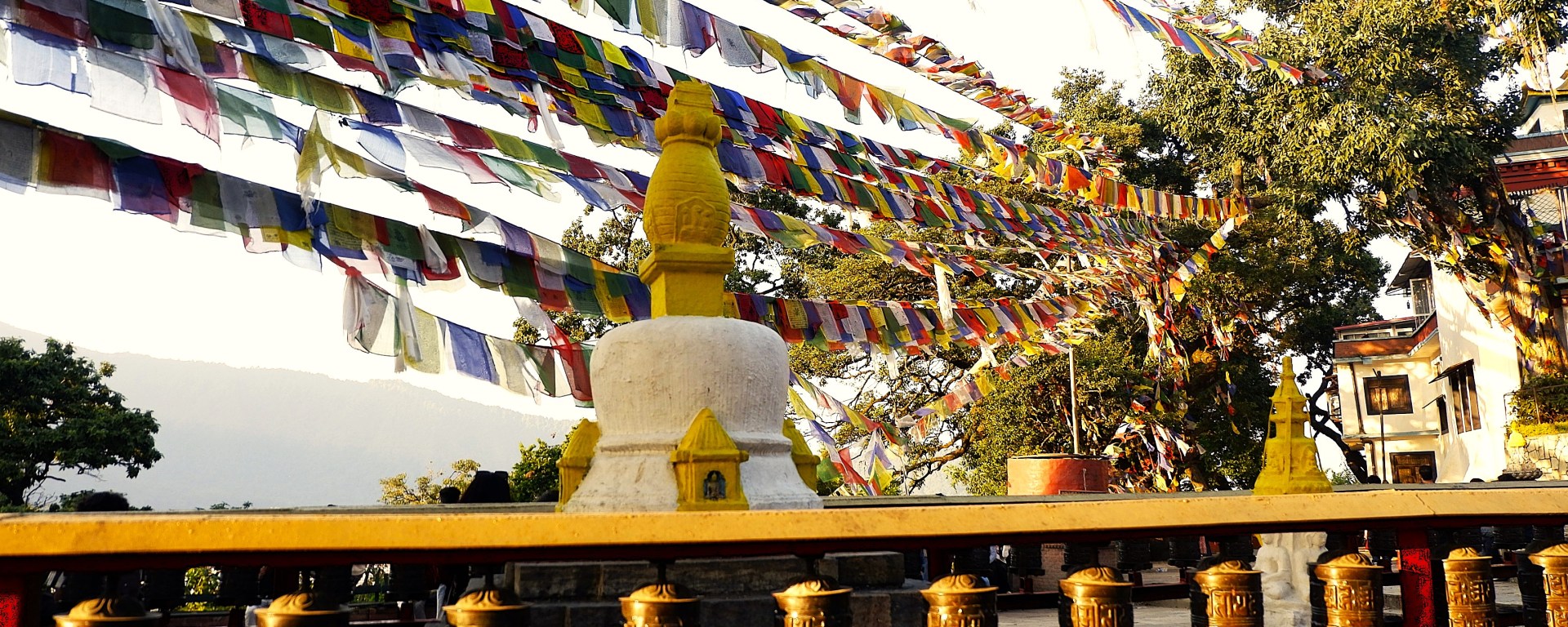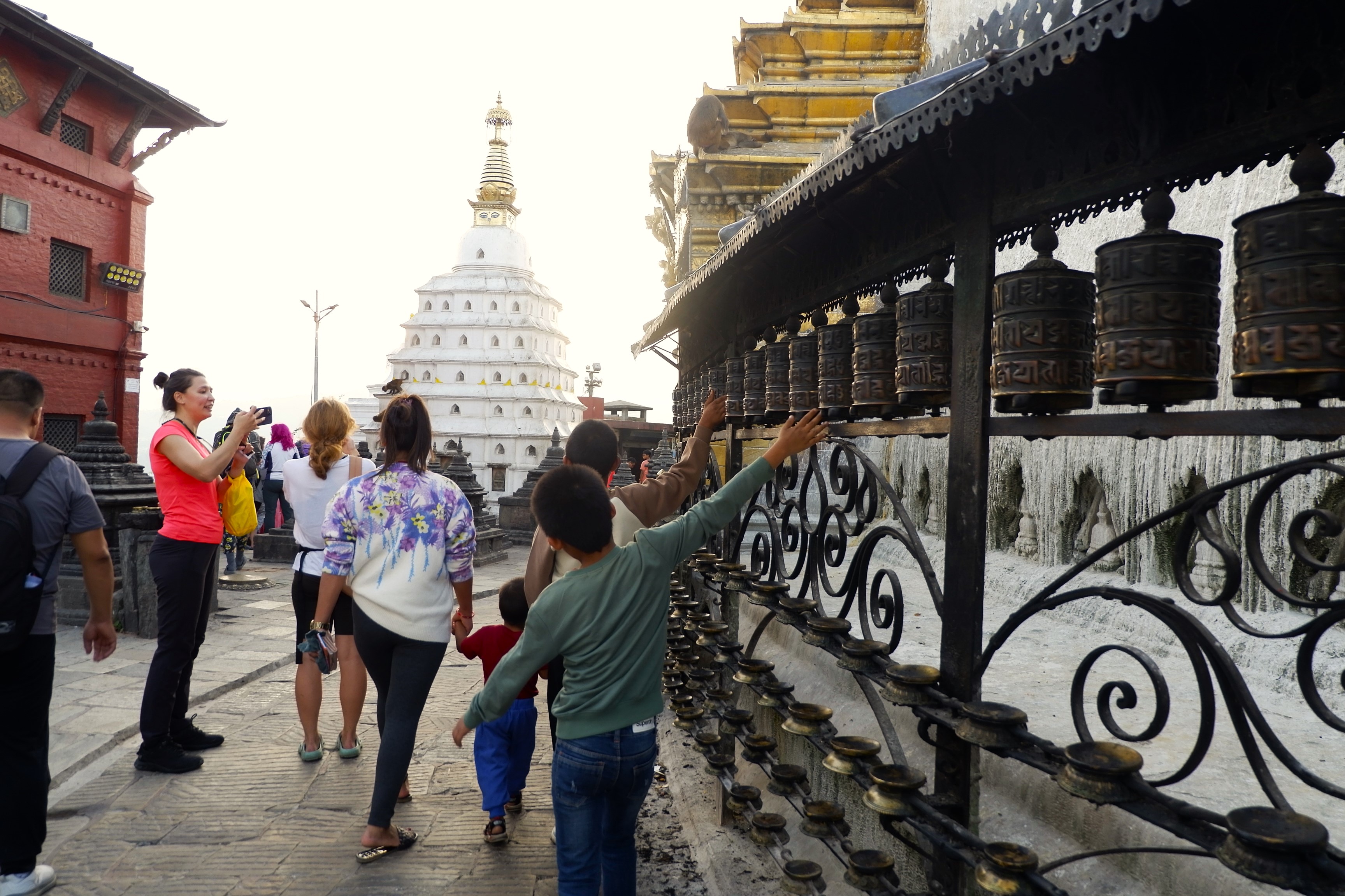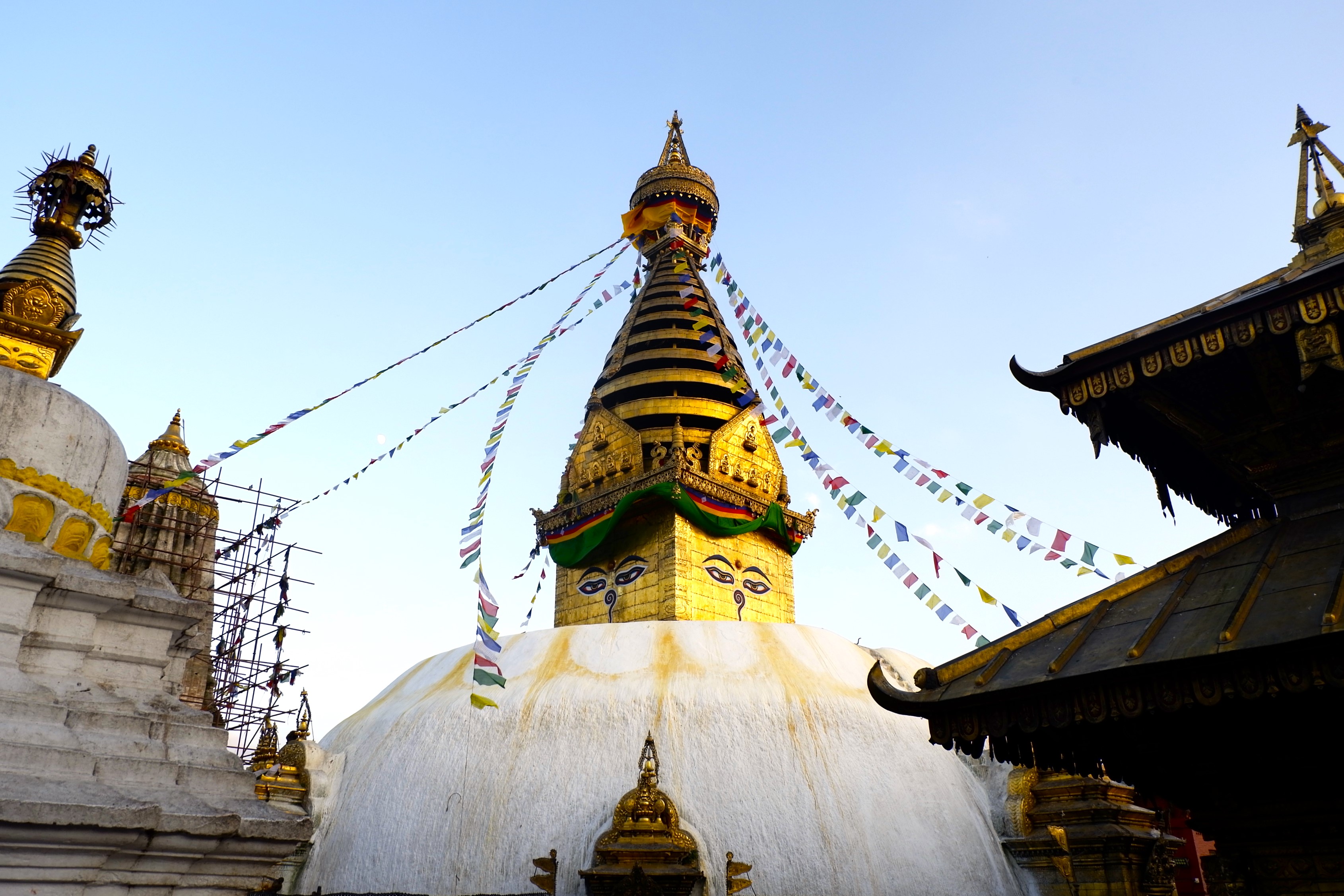 Đổi lại, tôi tới một bảo tháp khác ở trên đỉnh đồi phía tây của thung lũng Kathmandu – khu phức hợp chùa tháp Swayambhunath hay gọi theo một cách khác dễ nhớ hơn là Monkey Temple, nơi cư ngụ của một đàn khỉ có số lượng thành viên lớn đã sinh sống tại đó qua hàng thế kỷ. Từ cổng chùa, tôi đi theo hướng bậc thang bên tay trái, leo một đoạn để lên phía tu viện trước, rồi mới quay lại, đi đoạn bậc thang bên phải để lên bảo tháp Swayambhunath.