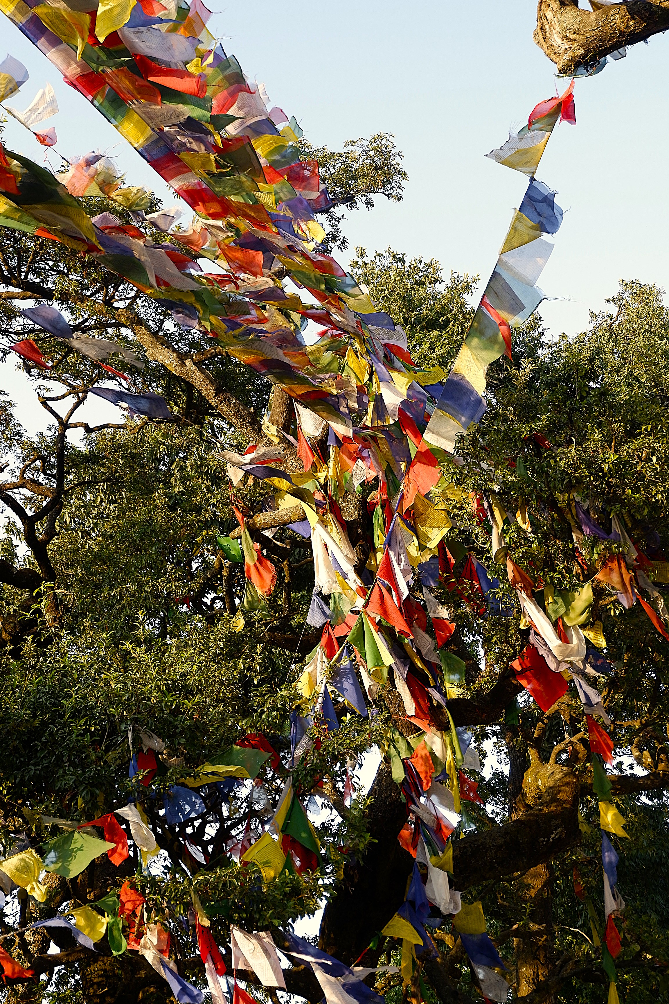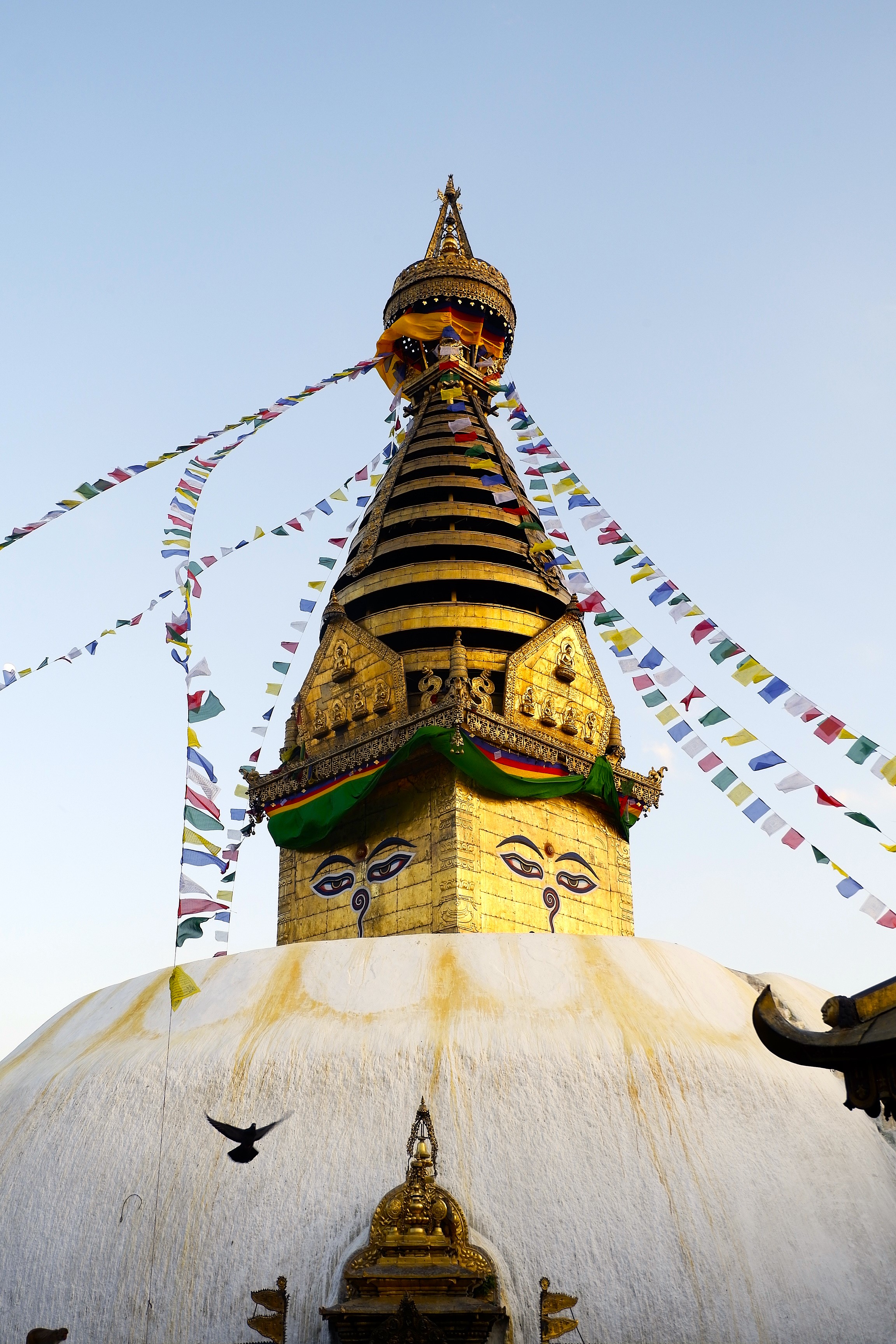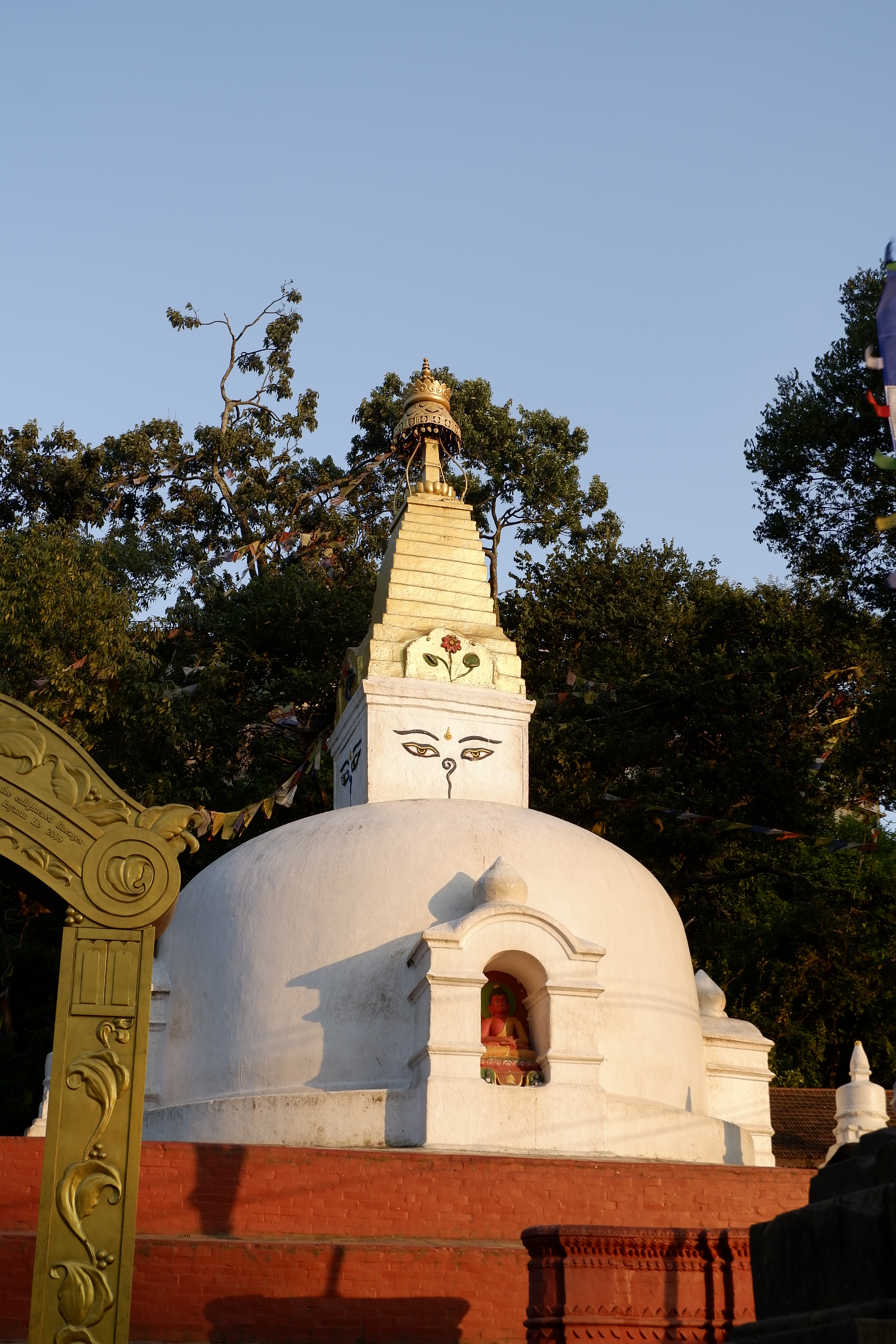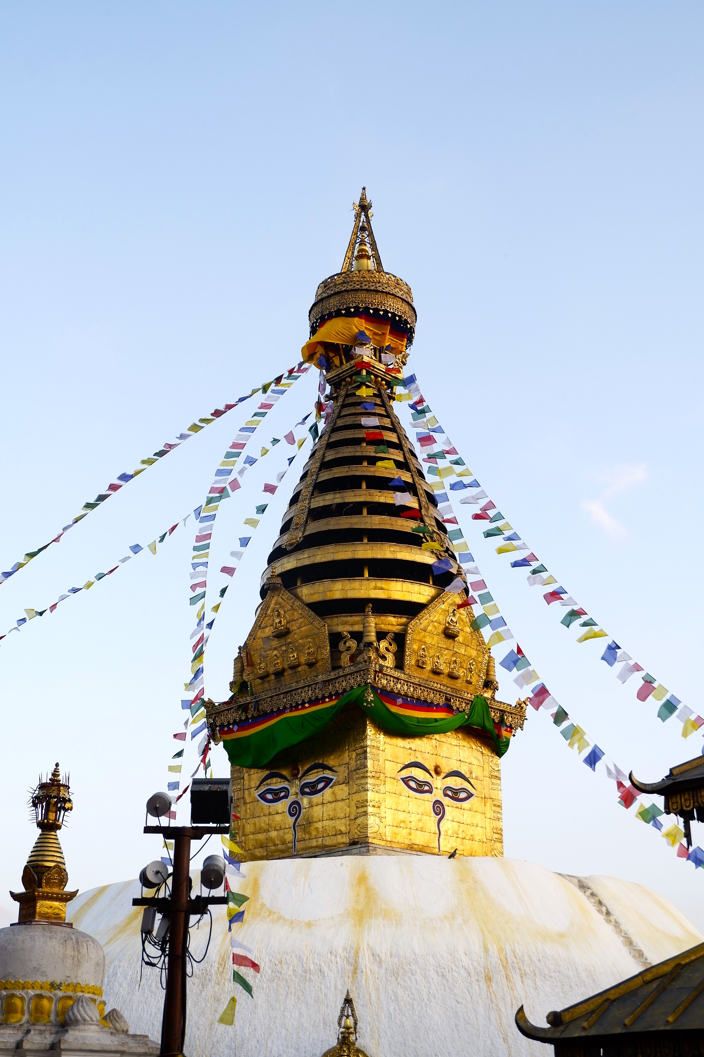 Đổi lại, tôi tới một bảo tháp khác ở trên đỉnh đồi phía tây của thung lũng Kathmandu – khu phức hợp chùa tháp Swayambhunath hay gọi theo một cách khác dễ nhớ hơn là Monkey Temple, nơi cư ngụ của một đàn khỉ có số lượng thành viên lớn đã sinh sống tại đó qua hàng thế kỷ. Từ cổng chùa, tôi đi theo hướng bậc thang bên tay trái, leo một đoạn để lên phía tu viện trước, rồi mới quay lại, đi đoạn bậc thang bên phải để lên bảo tháp Swayambhunath.