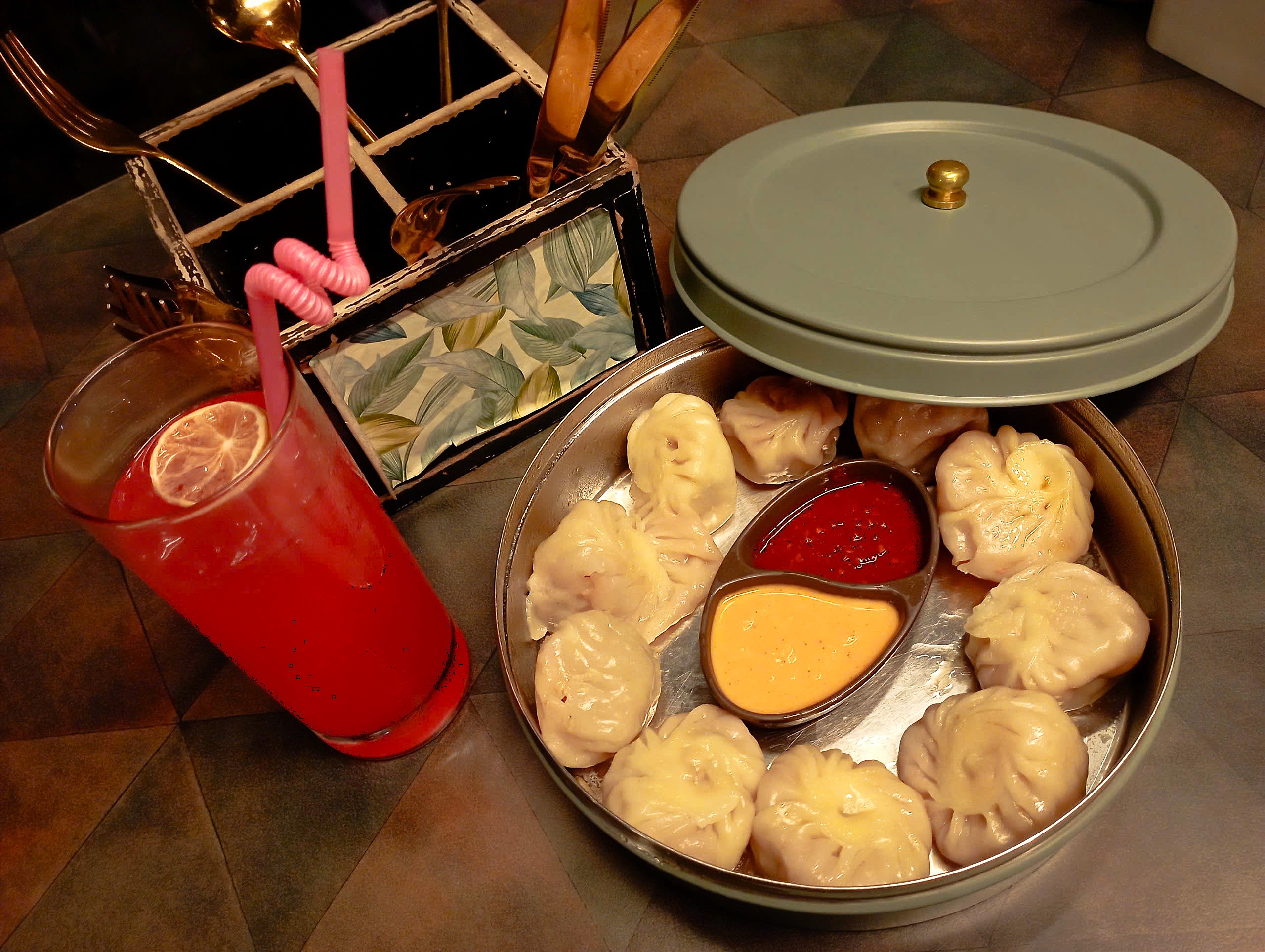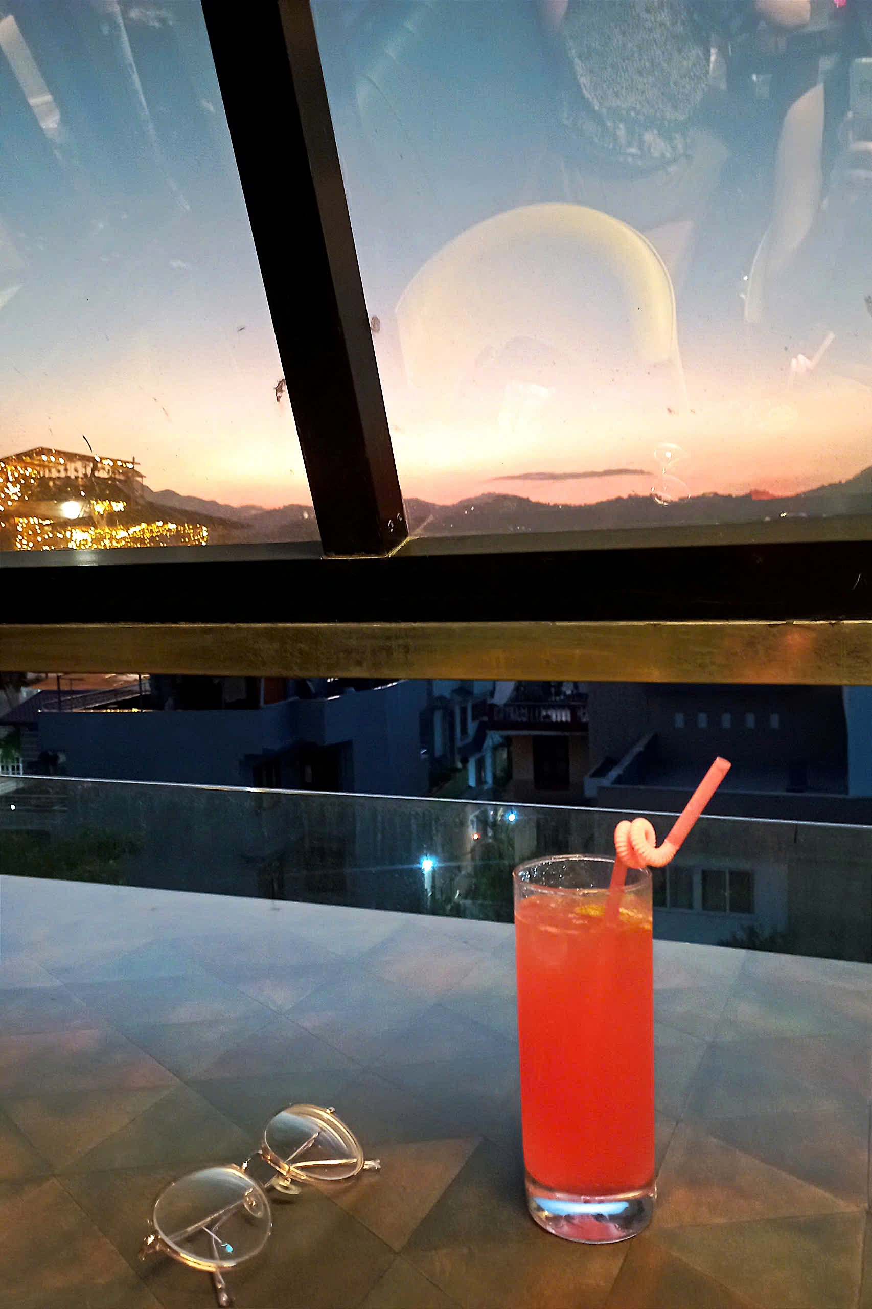 Buổi chiều từ Bhaktapur chạy sang, tôi chỉ kịp cất đồ, nghỉ ngơi một chút thì trời đã trờ tối, đành vội vội vàng vàng thay một bộ đồ rồi chạy lên quầy bar trên tầng thượng, tìm một góc bàn bên khung cửa kính, vừa đuổi kịp những phút cuối cùng của áng chiều hồng rực phía rặng núi bên rìa thành phố. Ban đầu, tôi chỉ định gọi đồ uống ngắm khoảnh khắc ngày tàn đêm buông rồi lang thang tìm một nhà hàng cho bữa tối, nhưng cuối cùng, không chống lại được cơn đói cồn cào, tôi gọi luôn một khay momos hai loại nhân: rau chay và thịt trâu, cùng một ly cocktail vị quả lựu, màu cam hồng tiệp vào màu hoàng hôn. Sau này tôi mới biết, Nectar by Carpediem – quầy bar tầng thượng nơi tôi ở là một trong những bar ngắm hoàng hôn nổi tiếng nhất ở Kathmandu. Vậy là tôi lại được cộng một điểm may mắn trong bài thi nhân sinh của mình.